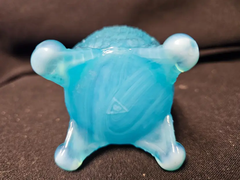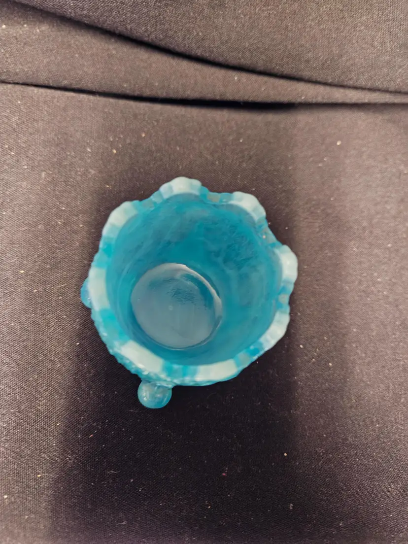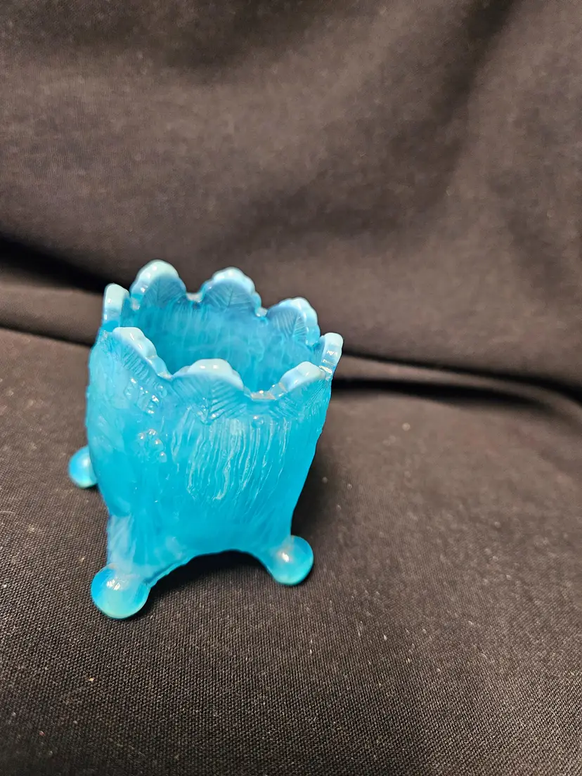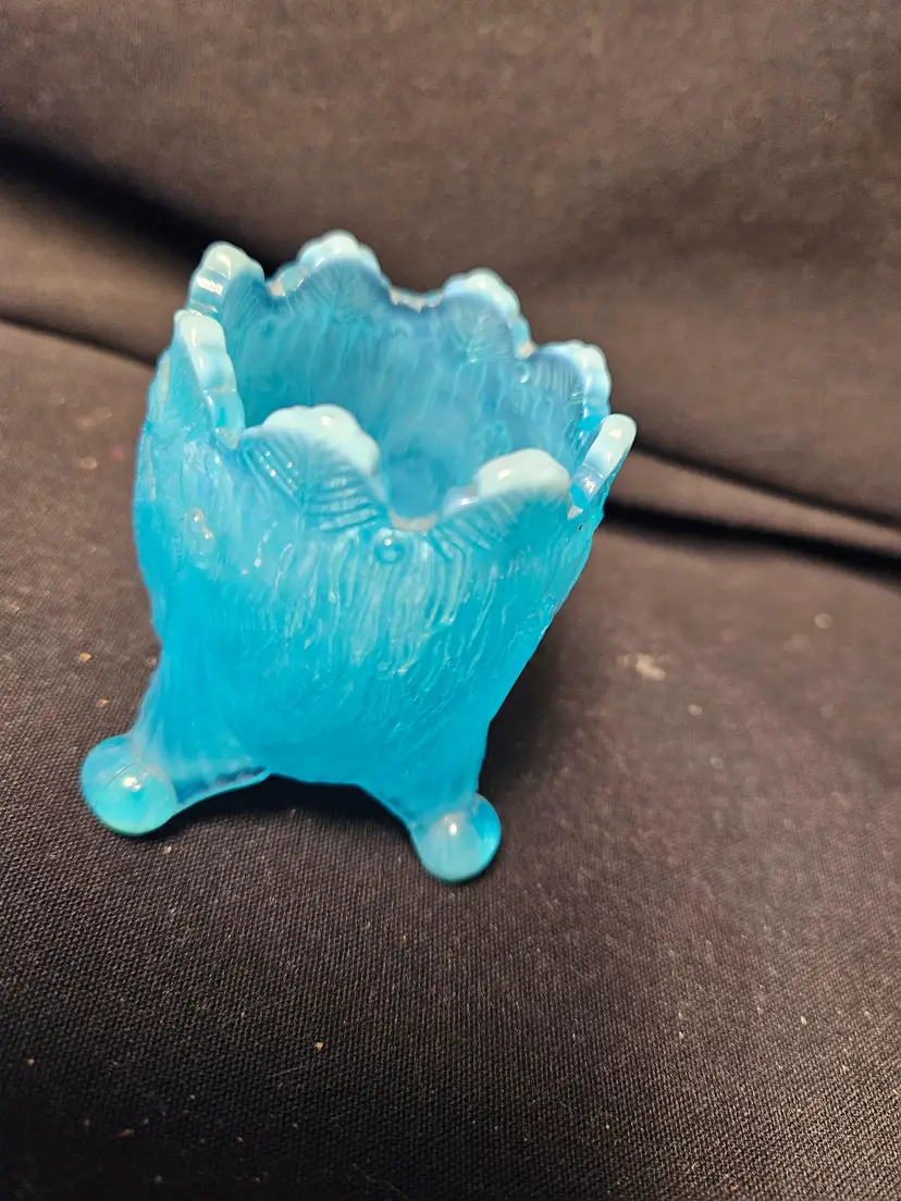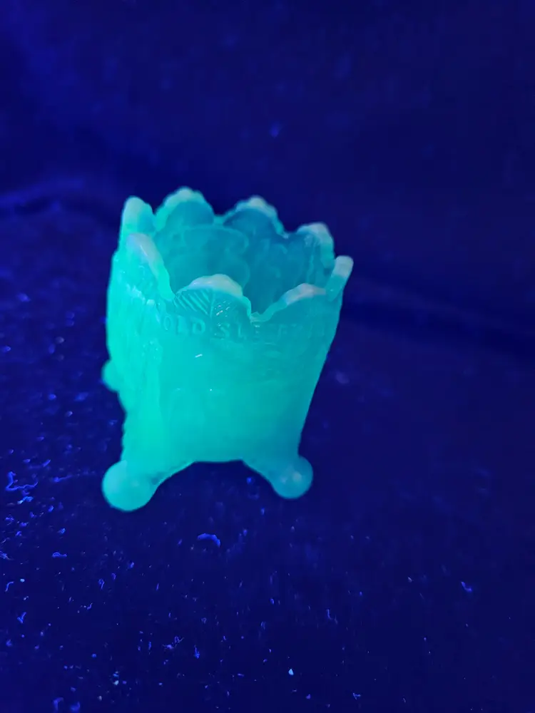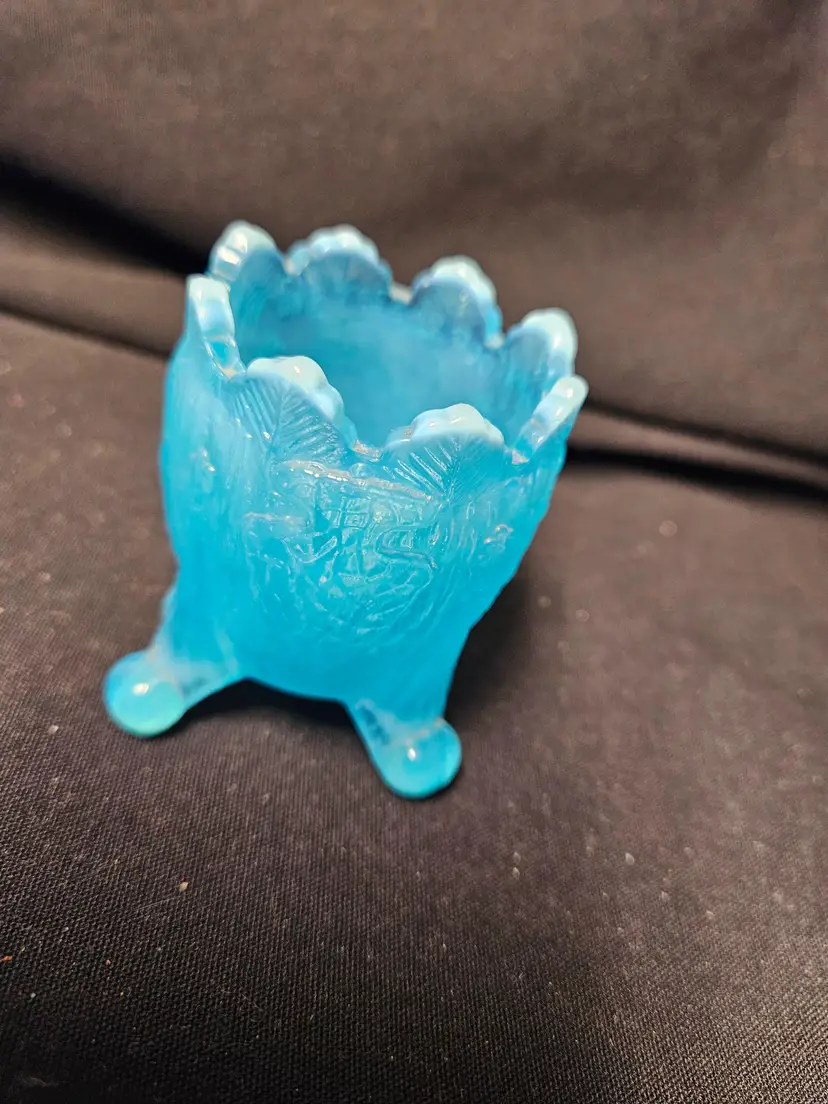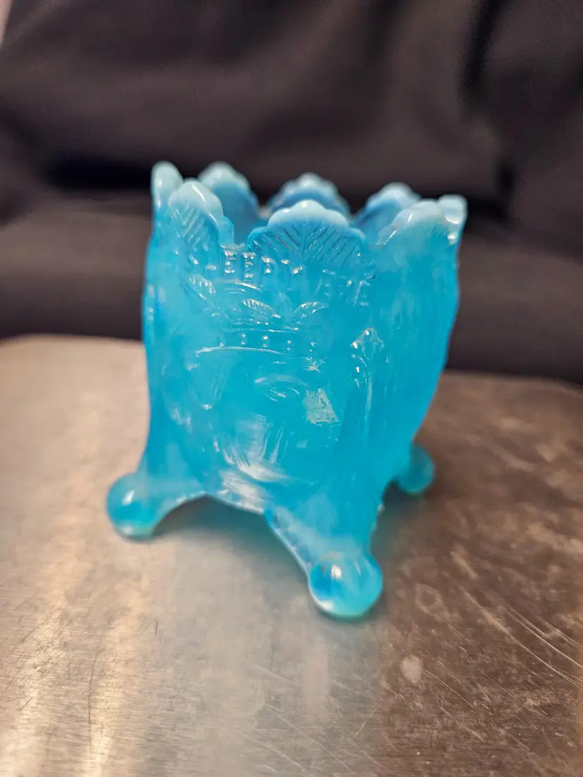 Maker:Boyd Height: 2 1/2" Glows: Yes Description: Nice little blue footed glass toothpick holder. It has a picture of an Indian and Old Sleepy Eye at the top. The other side has an arrowhead on it. It has the Boyd Glass Co. mark on the bottom. It is in good condition with no chips or cracks.