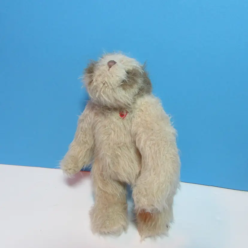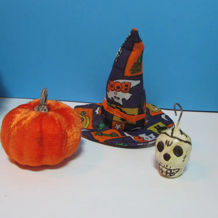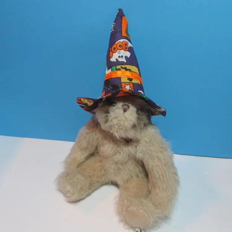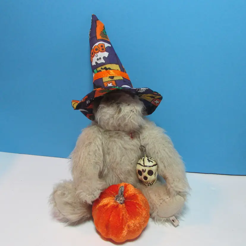 This adorable teddy has a handmade witch hat and has a pumpkin and vintage skull ornament to add for Halloween decor. The bear is about 8" tall. This is shipped from a smoke free home. Thanks for looking!