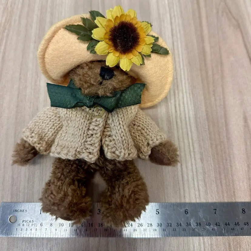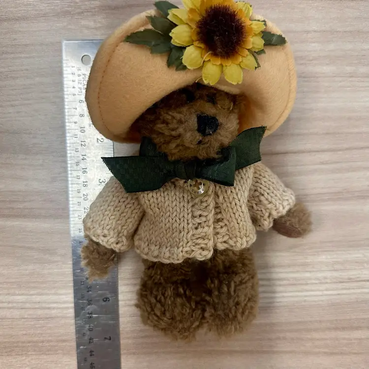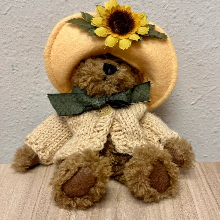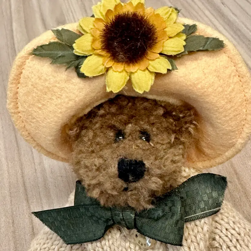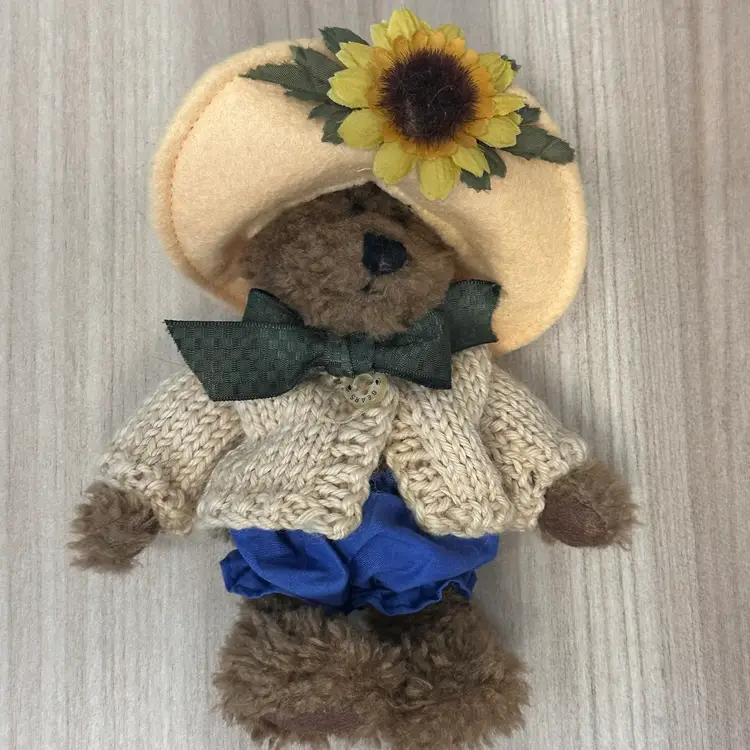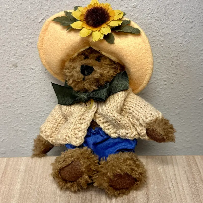 This listing is for this Boyds Bears & Friends Flora Mae Bloom With Joy Stuffed Animal Bear. It is a vintage 7-inch plush bear with a sunflower hat and blue shorts. This Friend Bear from the Bearington franchise is part of the Classic Collection and features a brown color with black eyes. Made of plush material in 1998, this original collector bear is a charming addition to any teddy bear collection.