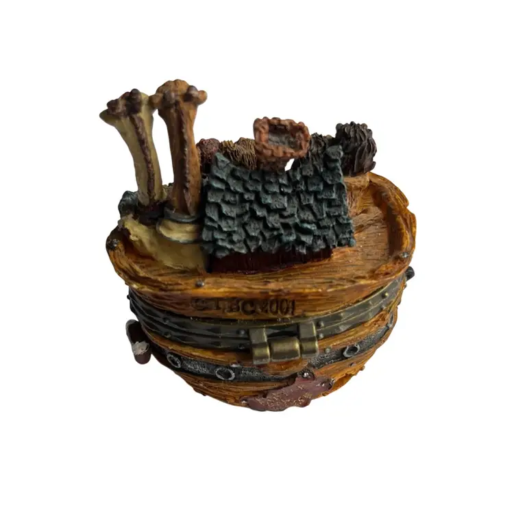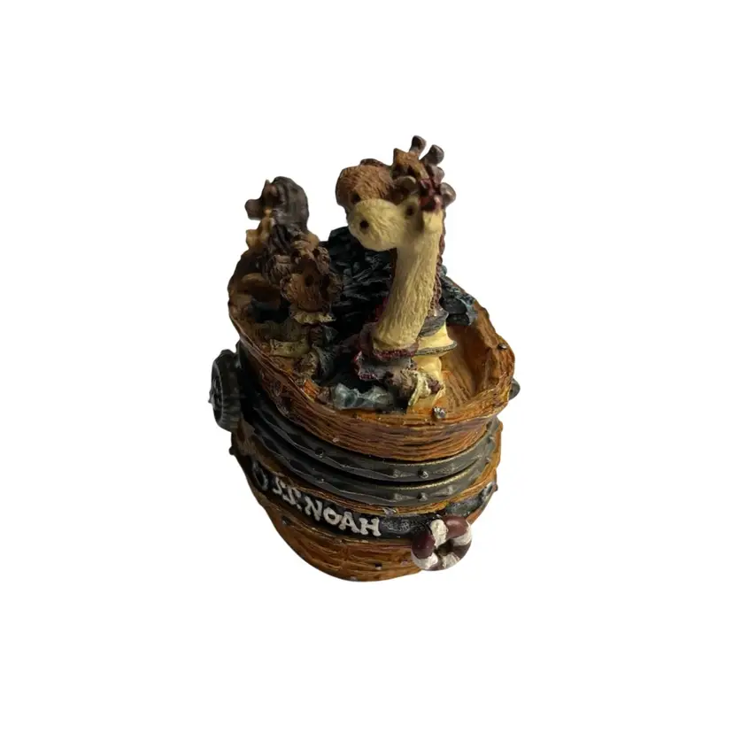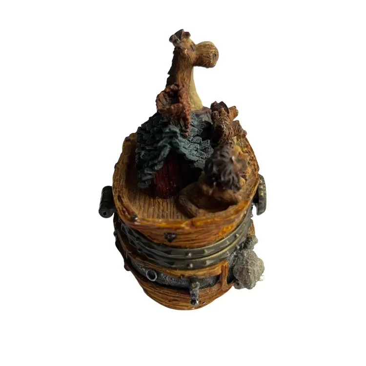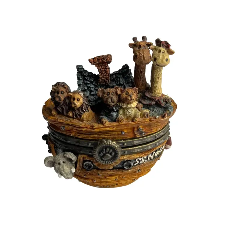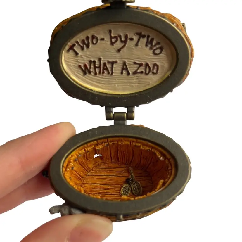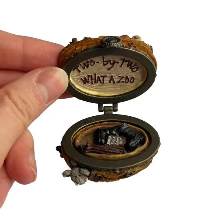 Approximately 2” x 1.25” x 2.25” when closed. No cracks. A few small paint chips to the edges of the lions and one in the rim of a boot. Comes with removable tray and mini mouse friend.