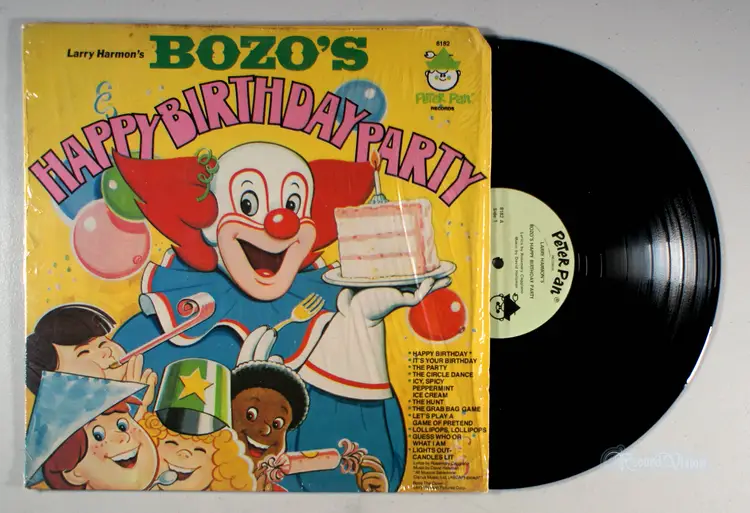 Bozo the Clown was created by Alan W. Livingston and portrayed by Pinto Colvig for a children's storytelling record album and illustrated read-along book set in 1946. He became popular and served as the mascot for Capitol Records. This particular record features songs for birthdays, such as Happy Birthday and It's Your Party.
