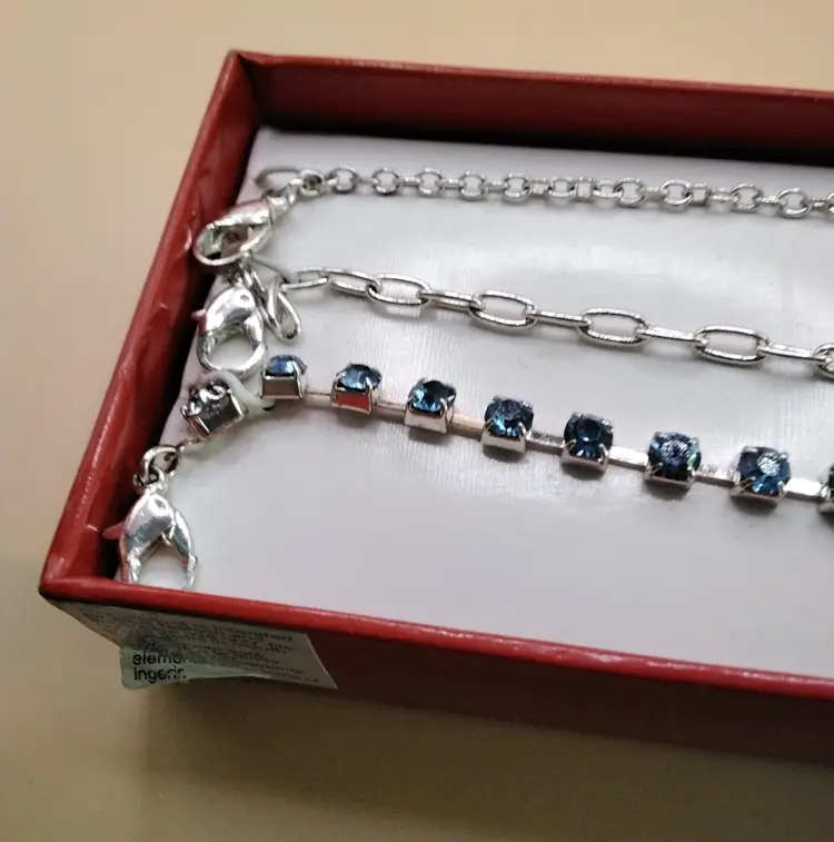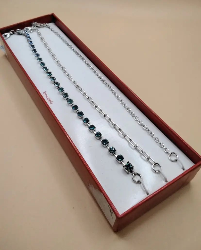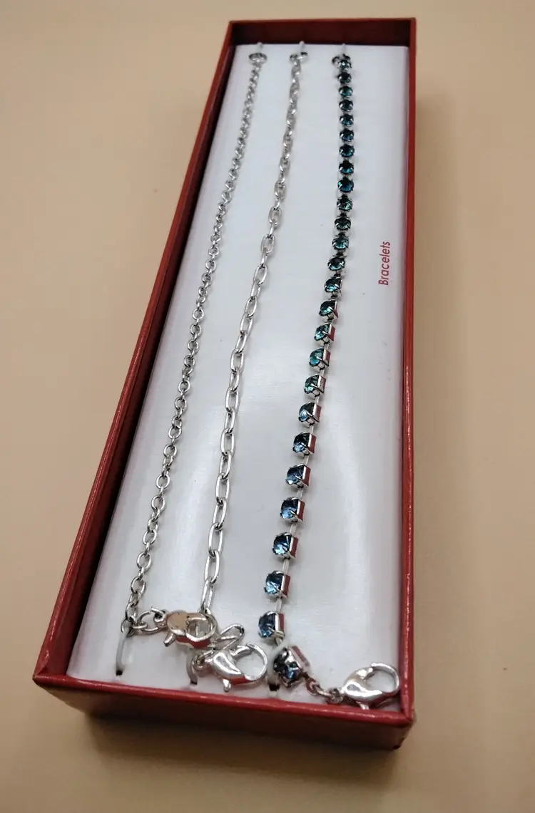 3 Bracelets in original red box. They are all 7 inches long and sliver toned. One has Blue Rhinestones and the other 2 are just links with one have smaller links than the other. They are in very good condition. Never been worn. Photos are part of the description.