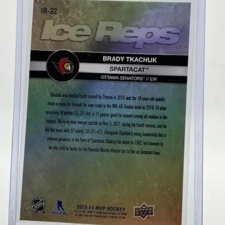 Brady Tkachuk Spartacat 2023-2024 Upper Deck MVP Hockey Ice Reps Ottawa Senators. Shipping is $1 for the first card, +$0.50 for additional cards, and ships PWE within 1-2 days.