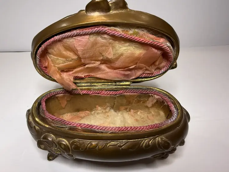Brainard & Wilson B&W Antique Footed Brass Hinged Trinket Box Casket Art Nouveau is in good condition. Item is over 100 years old, the silk interior has started to separate. (see photos).