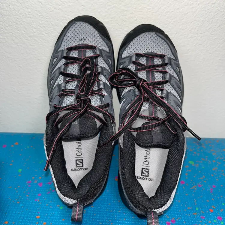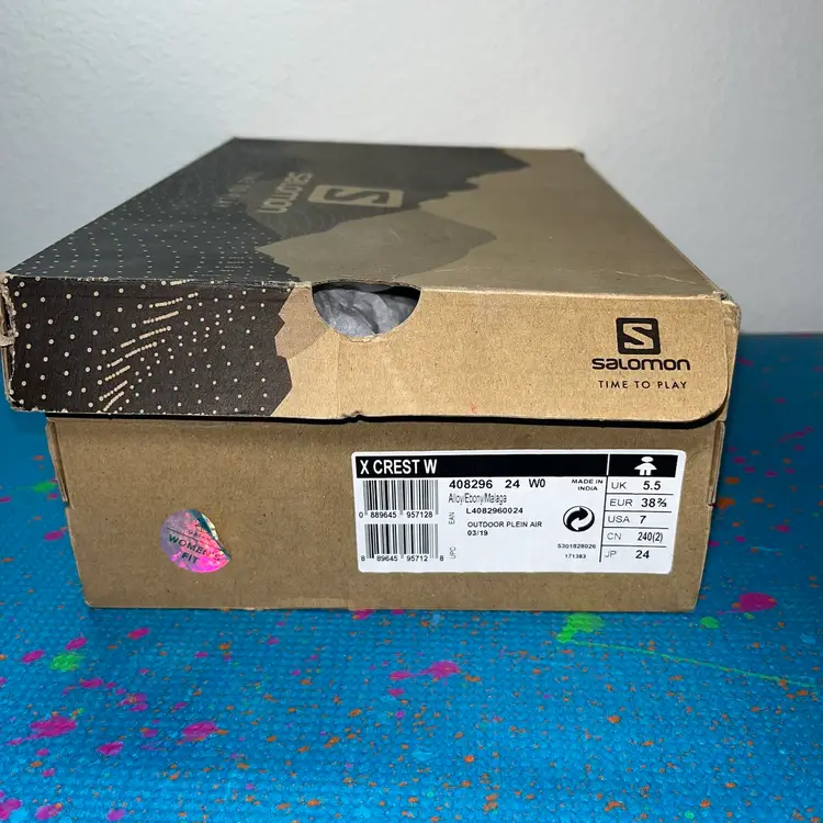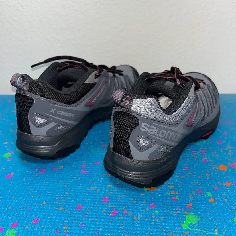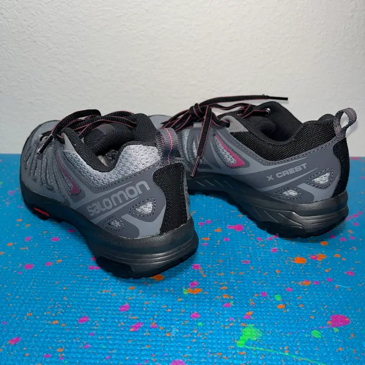 Brand New Salomon X Crest Womens 408296 Trail Running Shoes Sneakers Grey Pink Size 7 box is a little bit beat up hiking shoes