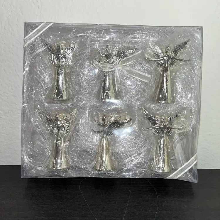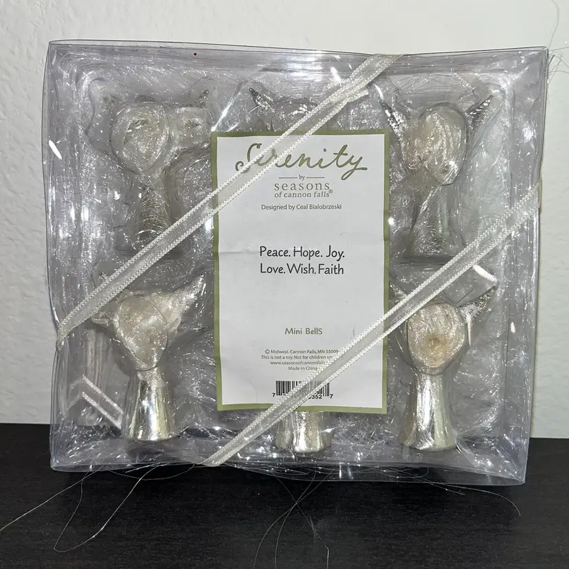 New Berenity by Seasons of Cannon Falls set of 6 mini angel bell ornaments. Each angel has a word on her wing — Peace. Hope. Joy. Love. Wish. Faith. • Designed by Ceal Bialobrzeski. • Each mini bell stands approximately 2-1/2" tall and has a small loop on the back for a hook or ribbon for hanging.