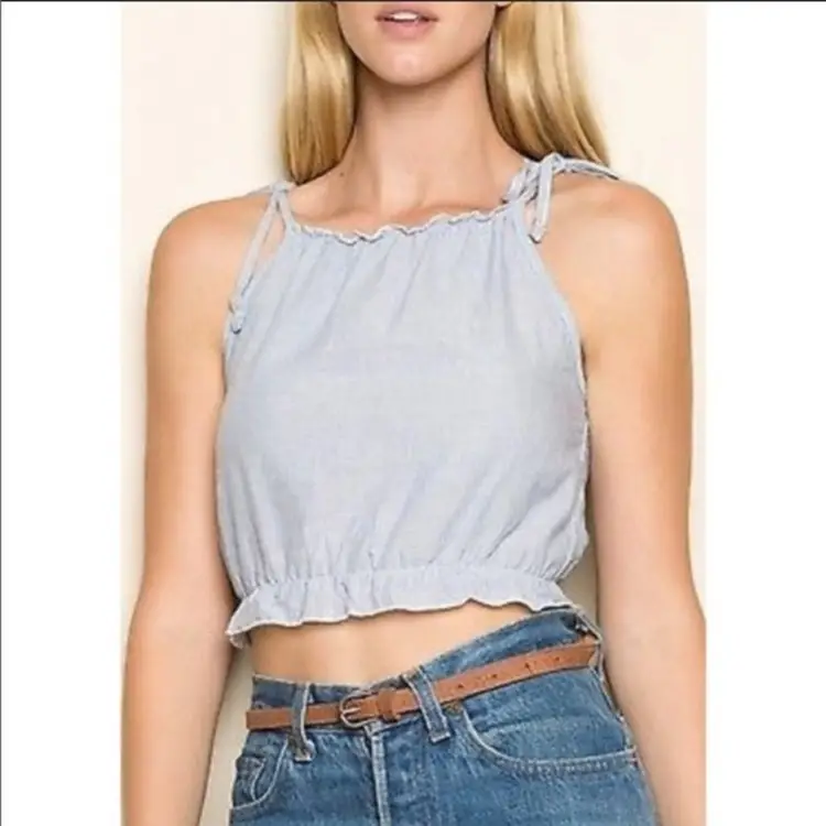 BRANDY MELVILLE~ Soft woven cotton tank in blue and white with self tie straps, elasticized waistband with ruffles trimming and a cropped fit. Size S~one size Tie Spaghetti Strap ~Crop Pinstripe Blue/White Tank Top Bottom gather measurements when fully stretched is 16"