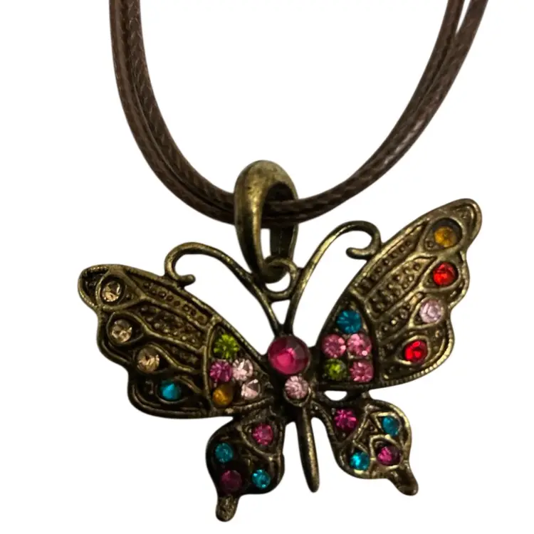 Nice brass and rhinestones butterfly on a brown cord necklace. Cord length is 14” with an inch and one half extender. The butterfly pendant measures 1 1/2” x 1 1/2” no stones are missing.