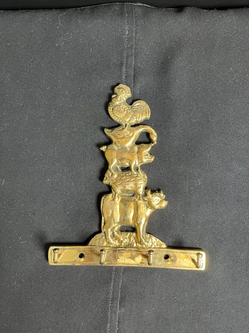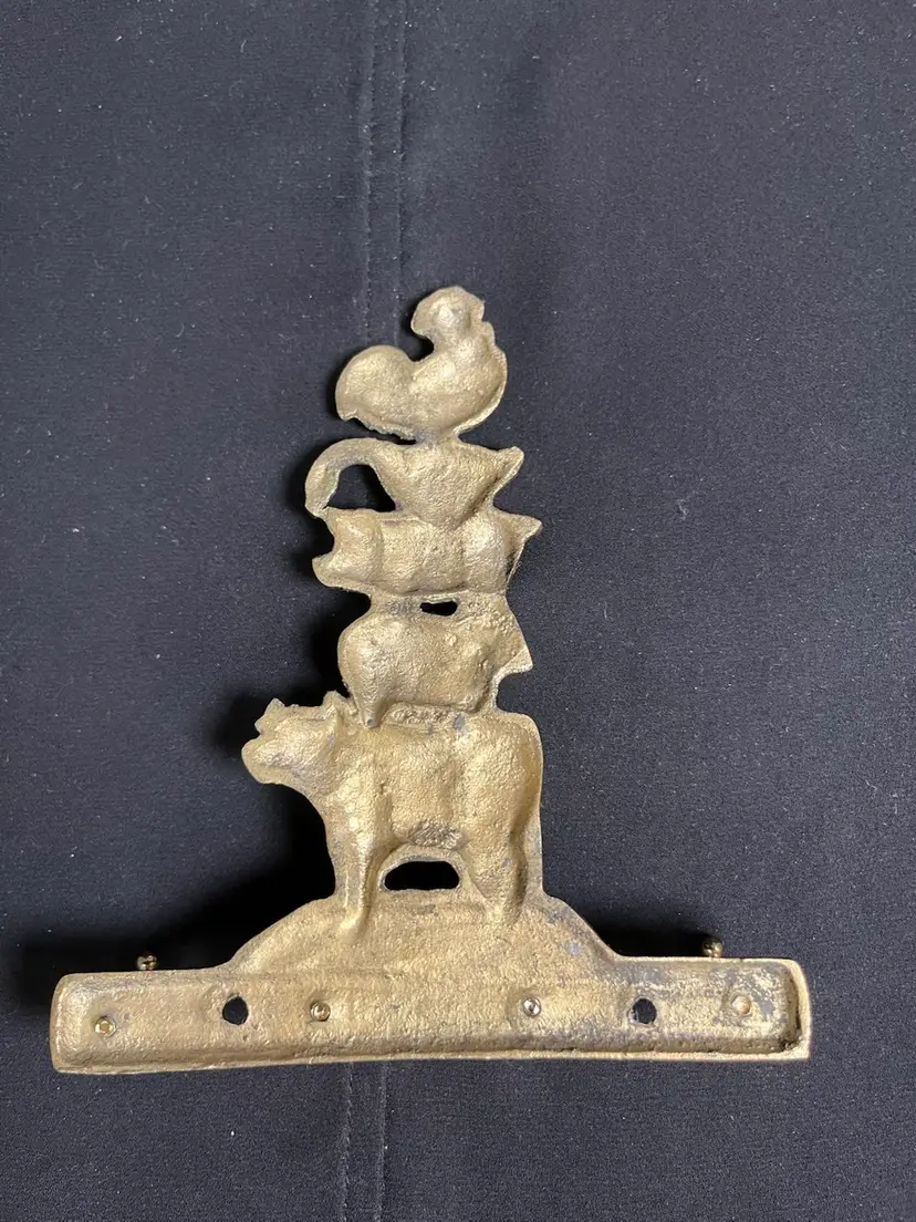 Features a stacked cow, sheep, pig, goose & chicken! 4 hooks-use for a key holder? or just something primitive and kitschy. Is in great vintage condition. 4.5" x 5.5", 4.1 Oz