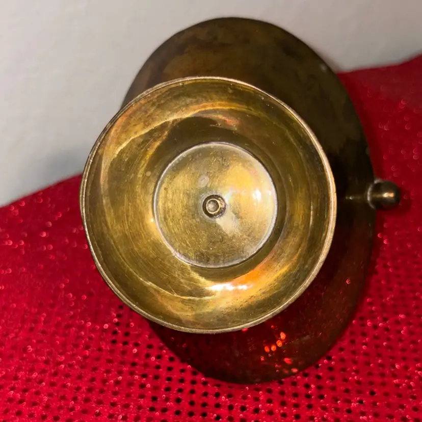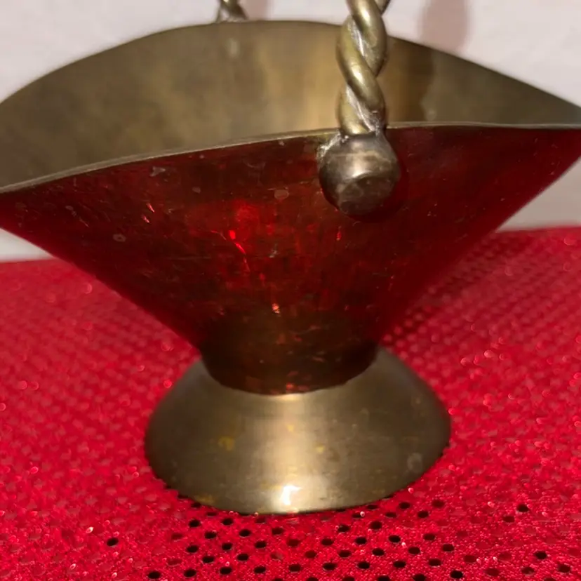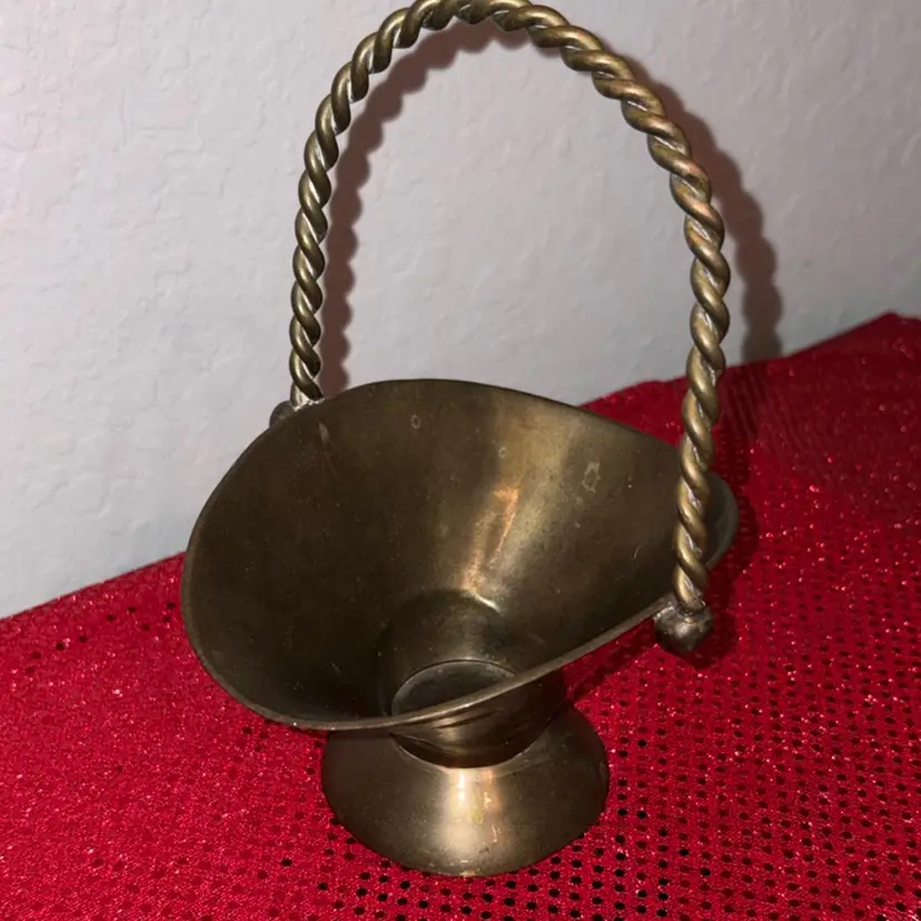AI Overview This is a vintage brass pedestal basket with a twisted handle. The basket is made of solid brass. It features a circular pedestal base and a bowl-shaped basket. The decorative handle has a twisted, rope-like design. These items were often made in India and used as decorative pieces, trinket dishes, or candy bowls. 8" tall