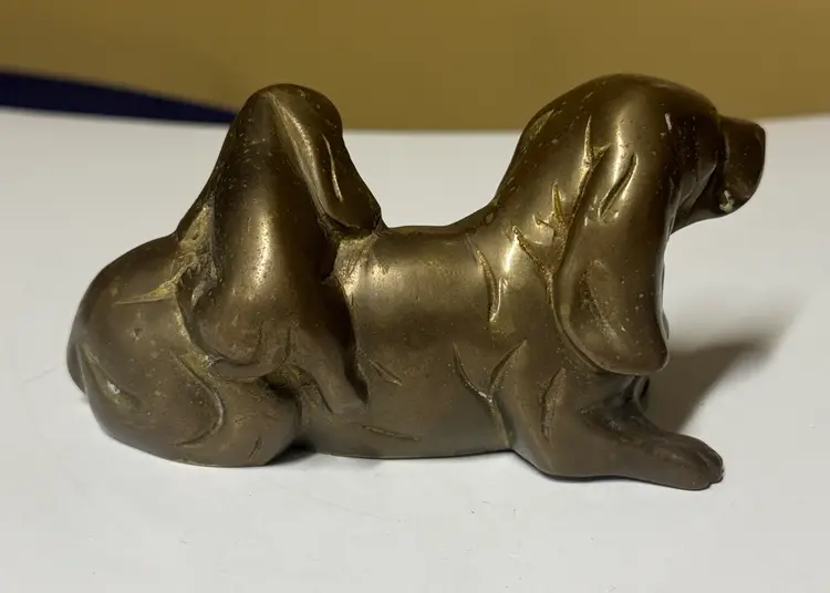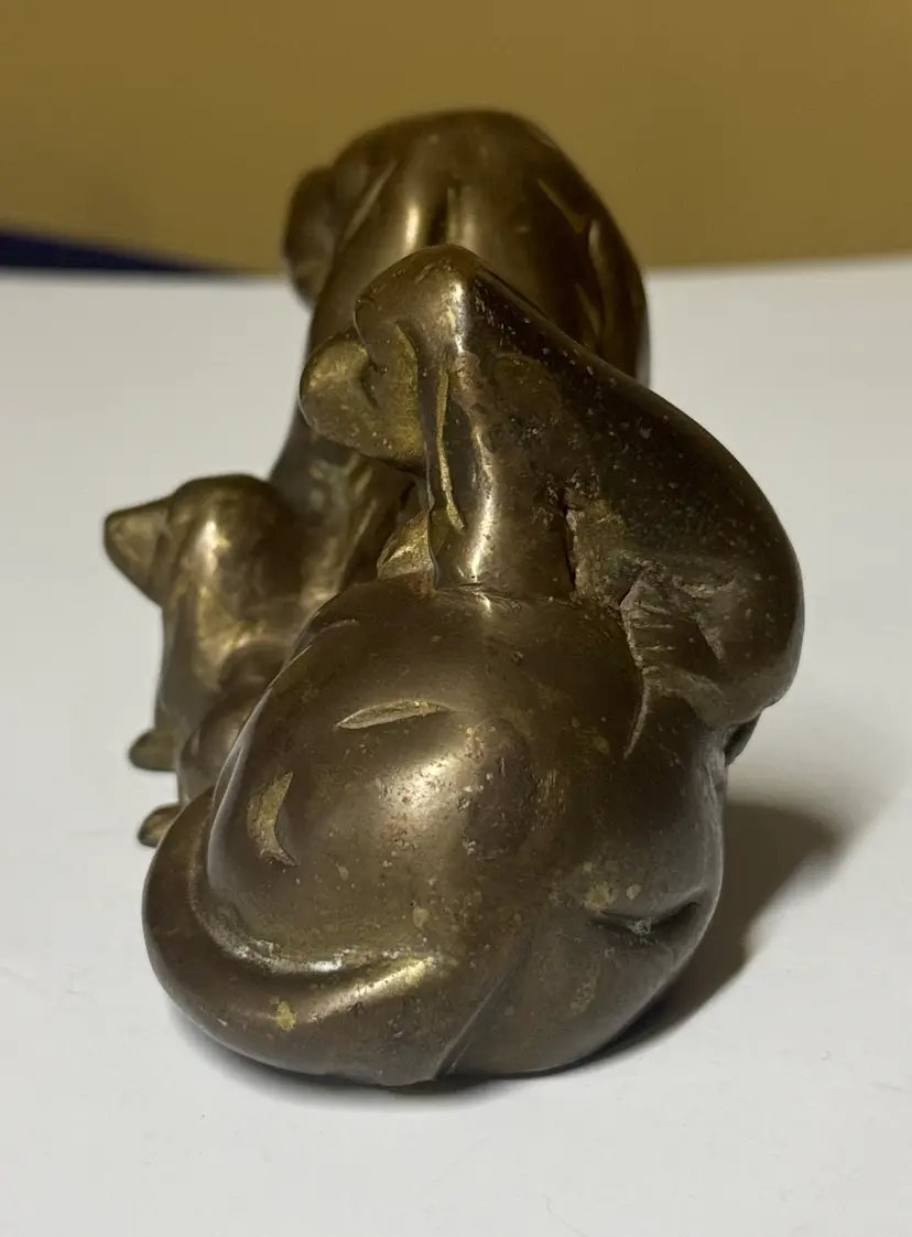 Brass Basset Hound dog family sculpture featuring a mother dog with her puppies. The item is a detailed collectible that has been noted for its character and patina. The sculpture is made of solid brass. It depicts a Basset Hound mother with two puppies. The piece has been identified as being part of the "Harvey Dogs" series by artist Marty Goldstein, where it is titled "Jake" 6” long 3.5” tall Excellent condition adorable (53114265)