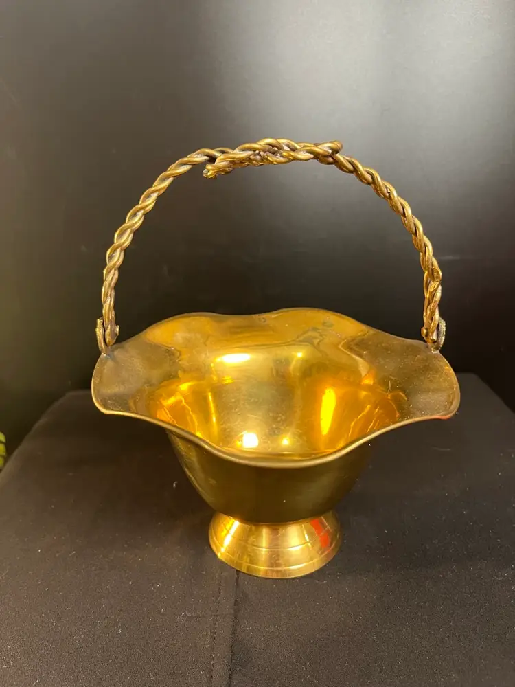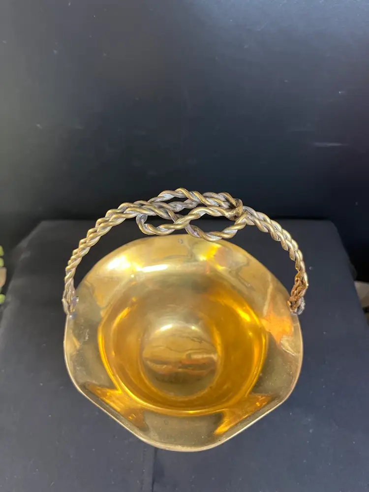 Sweet little bowl for many uses. Has patina. Love the details-see the pictures. No call outs. Measures approx-With handle up 6 1/2"H, 5 1/2" Diameter, 7.1 Oz. No makers mark.