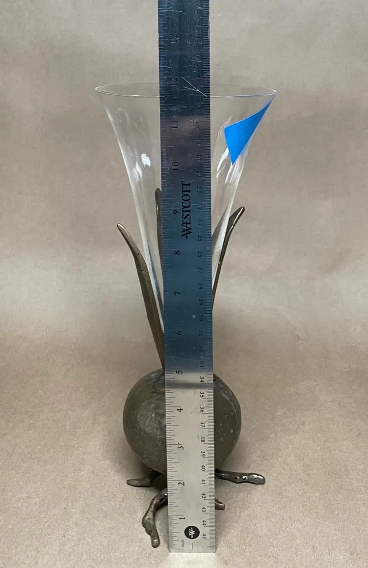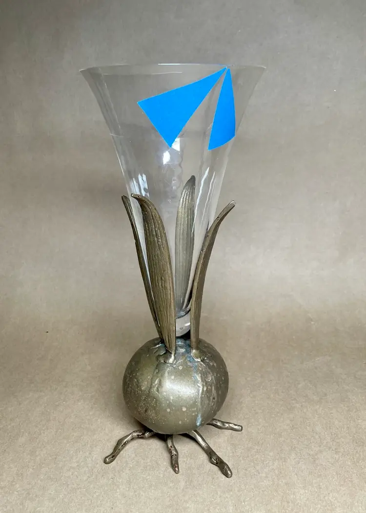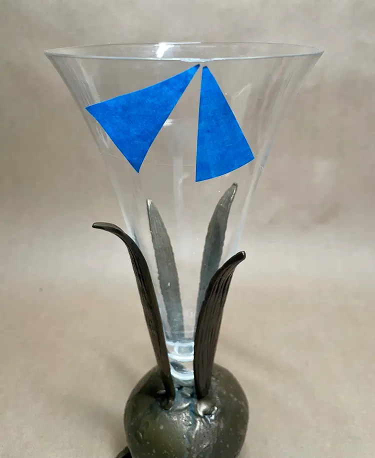 The blue tape points to a small chip in the lip of the glass vase.