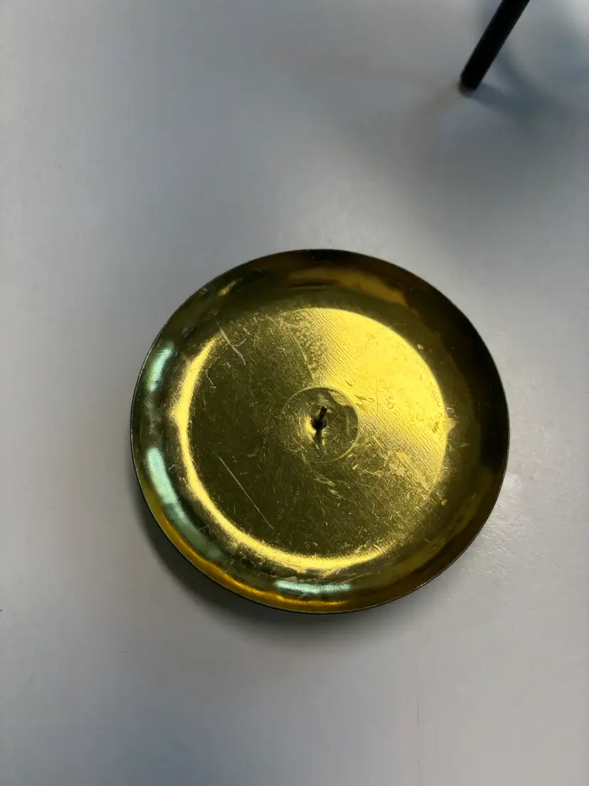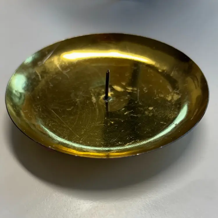 Brass candle holder plate, designed to hold taper or pillar candles and collect any dripping wax.