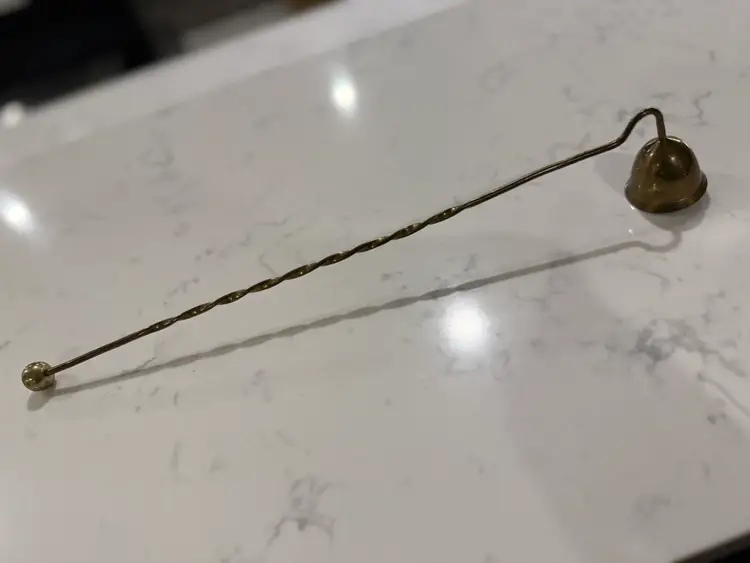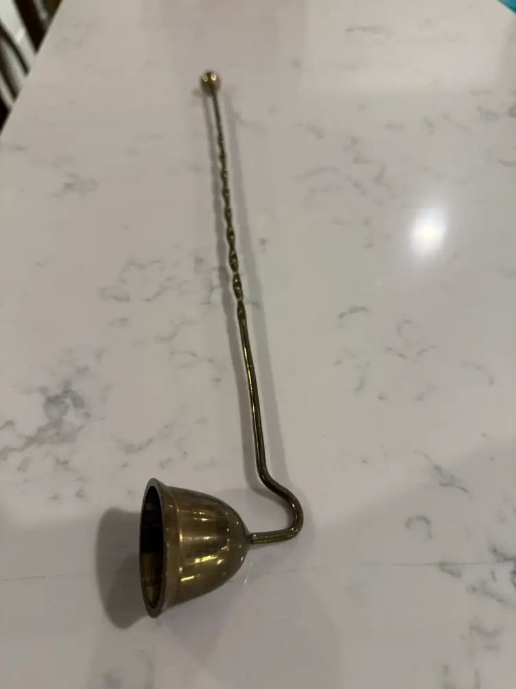 Vintage Brass Candle Snuffer featuring a distinctive twisted handle. This elegant accessory is perfect for safely extinguishing candles and adds a touch of classic charm to any home decor.