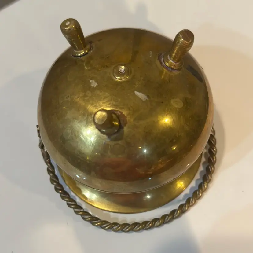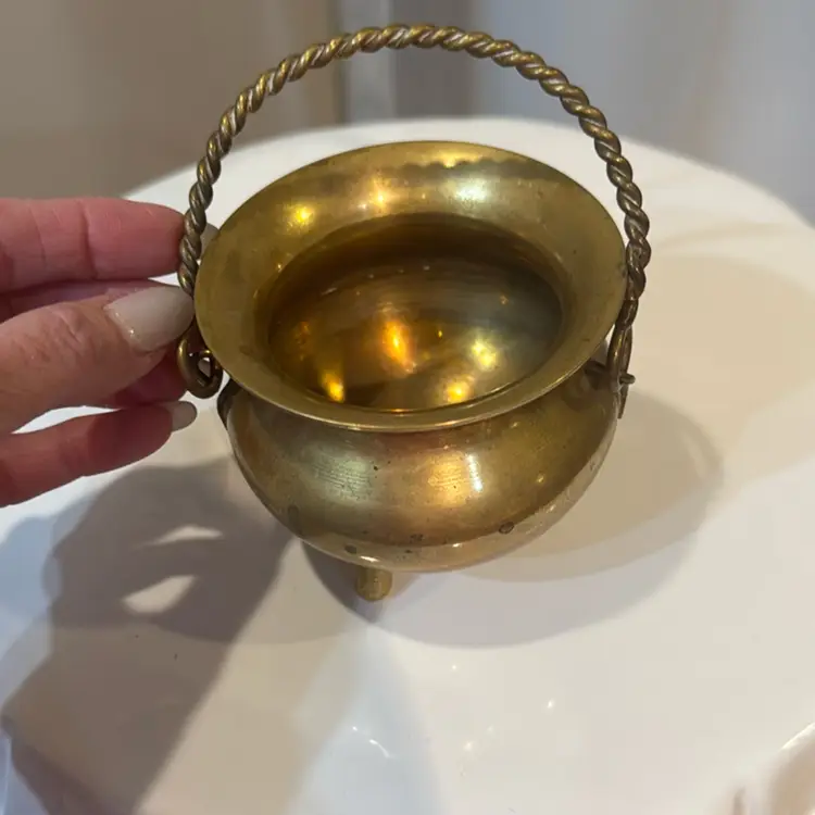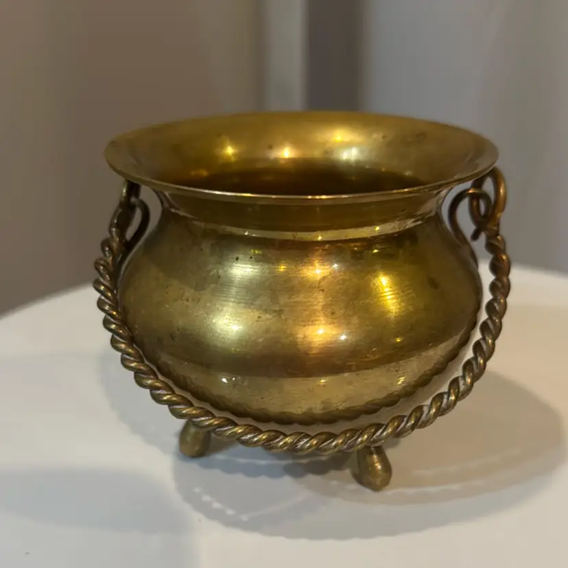 Small brass cauldron with twisted handle. 3-footed. Measures 3 inches tall.