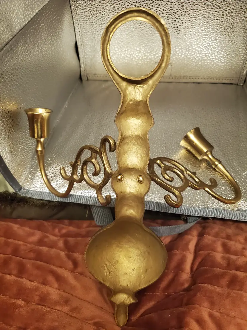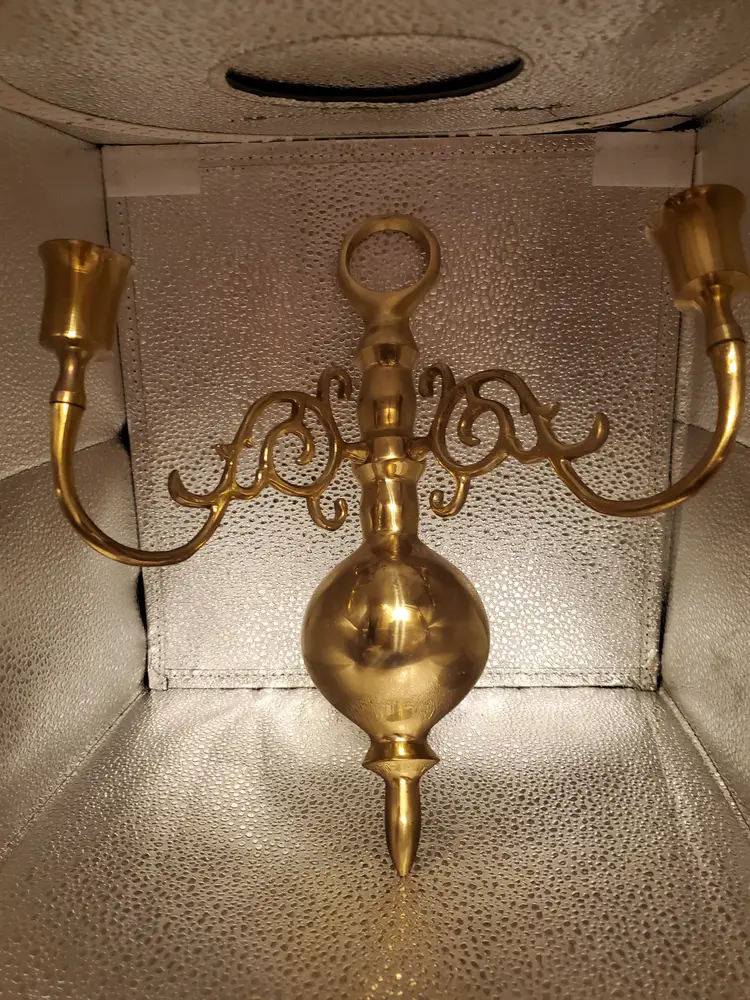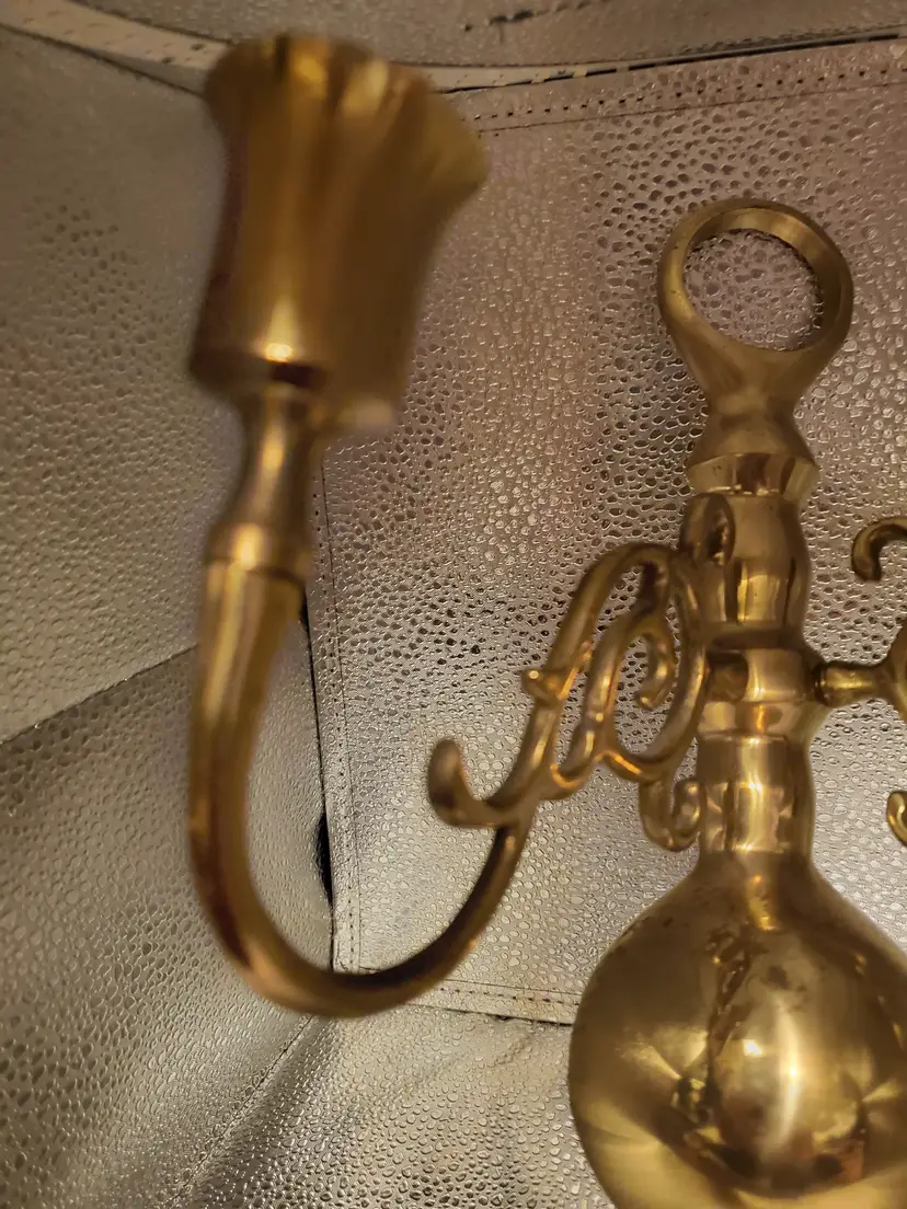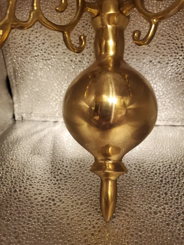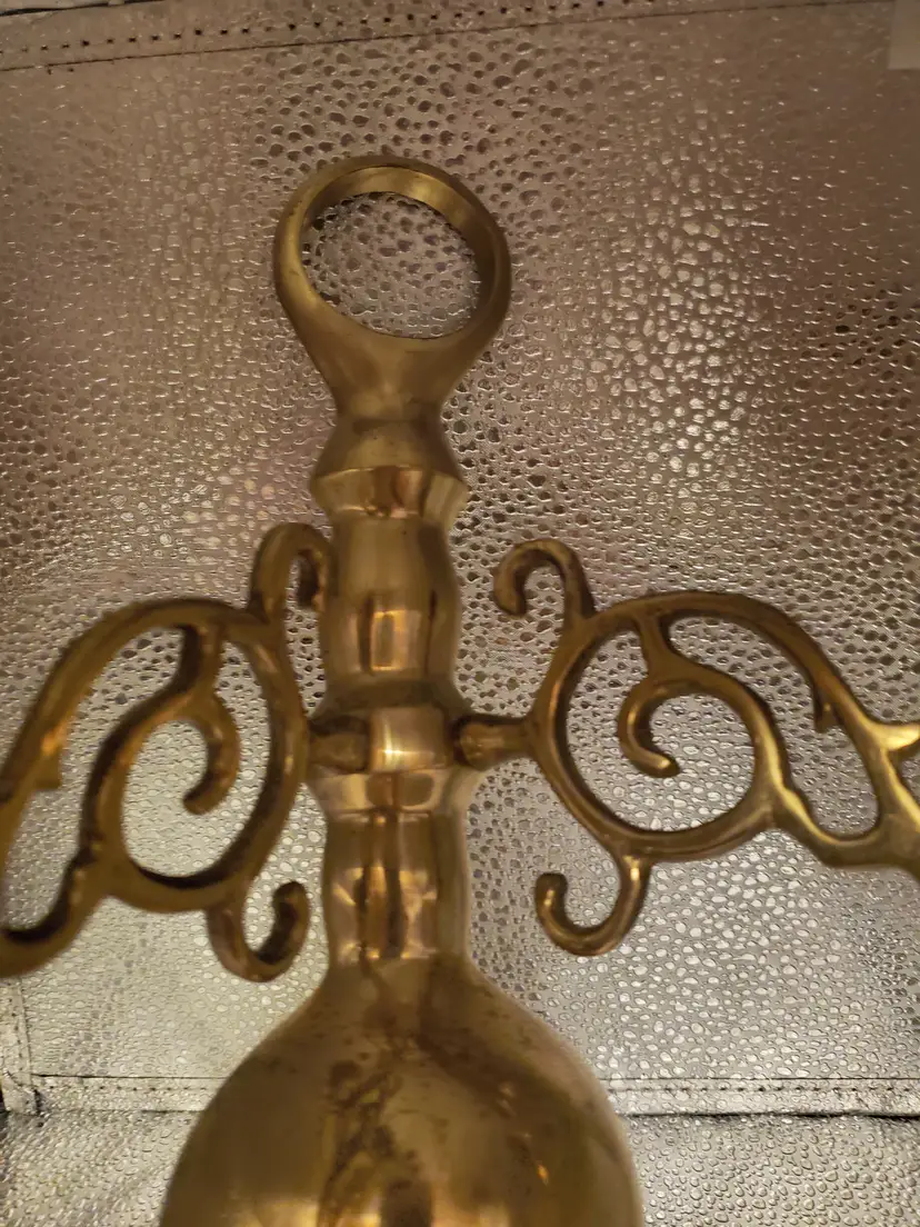Nice decorative brass wall scone. Double arm candle holders. 12 1/2" tall by 10" wide.