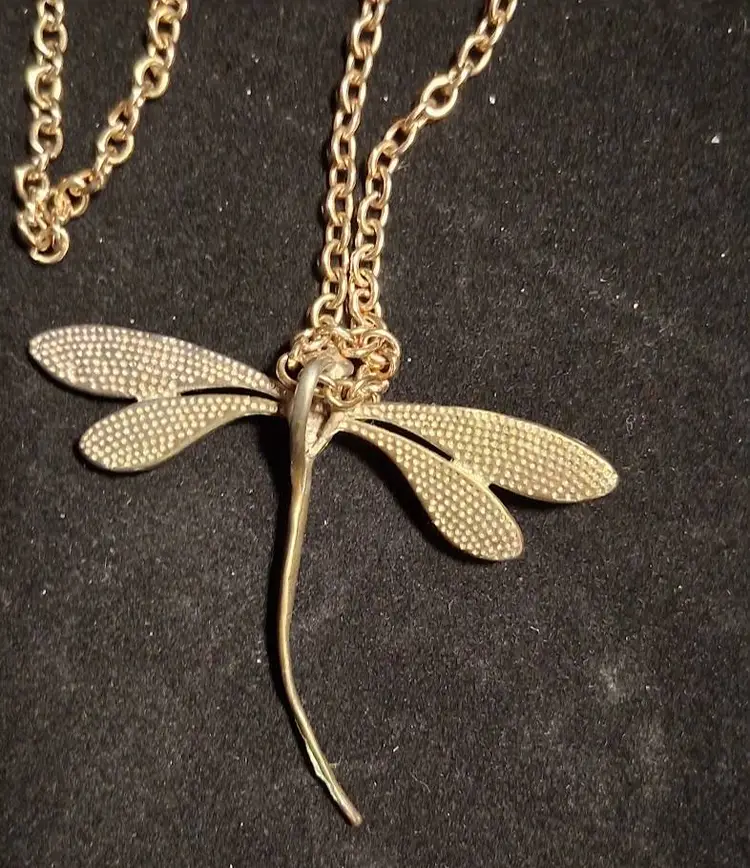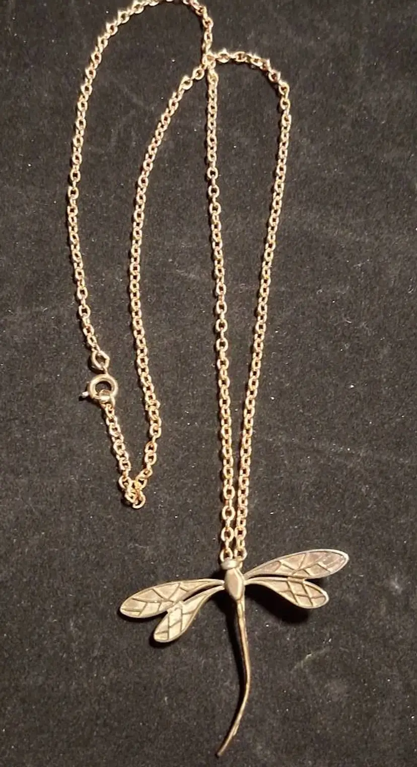Brass dragonfly pendant on gold-tone chain. Approx. 11" long-closed. Great cond.