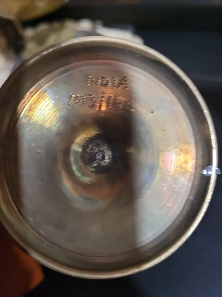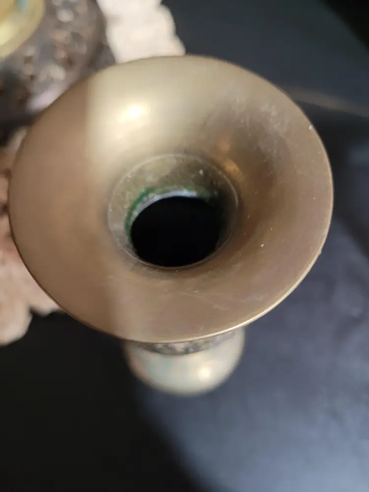 7 inch high vase, etched with green detailing. Made in India