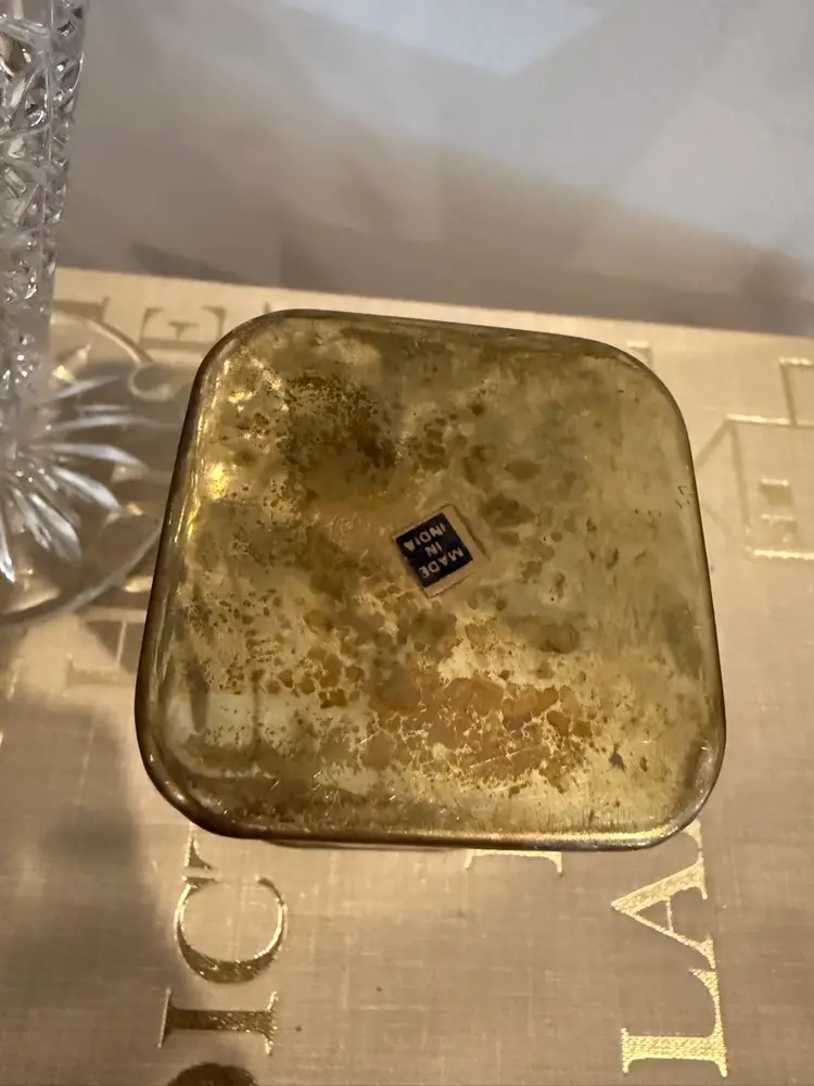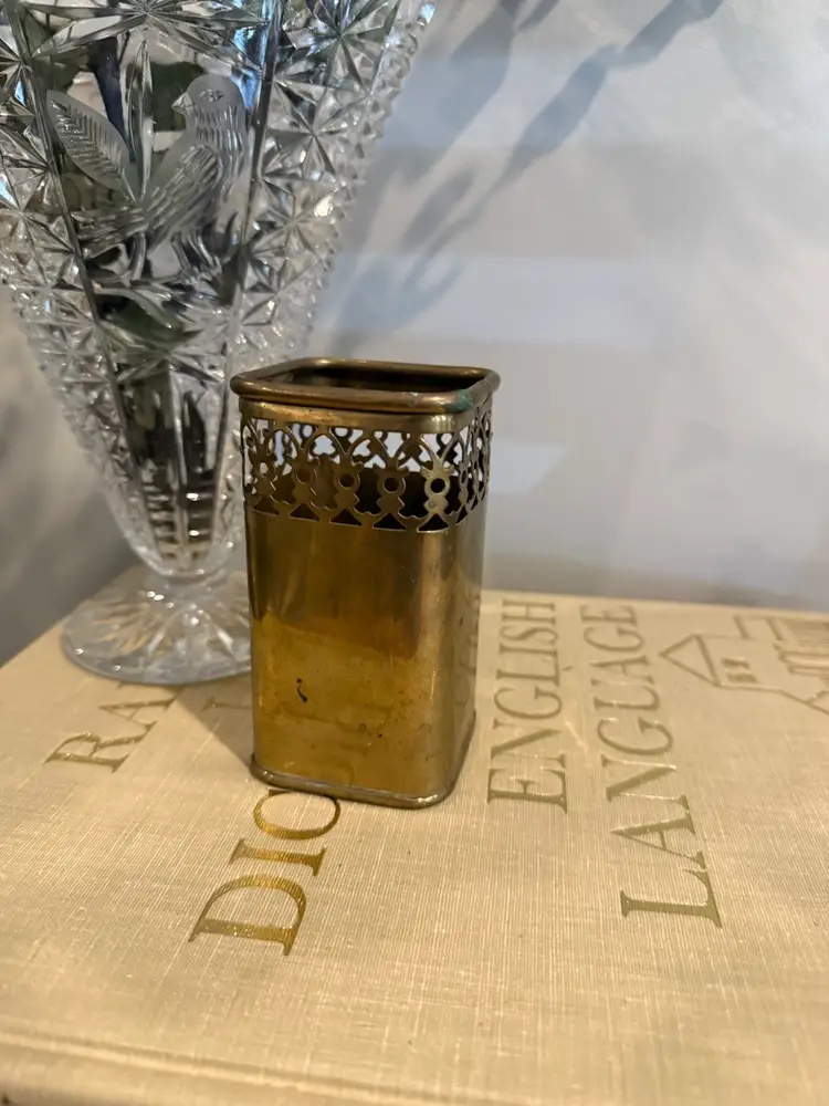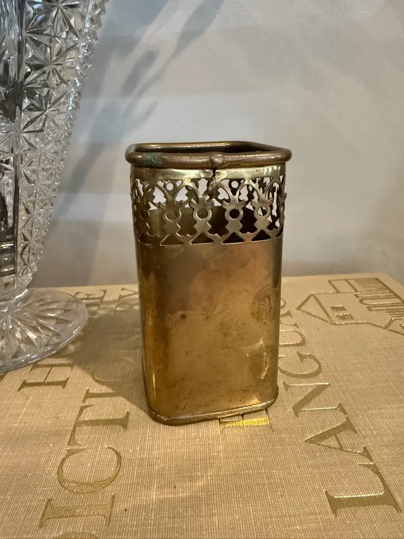 Vintage Brass Filigree Pen Pencil Holder — Made in India. This charming desktop accessory features intricate filigree detailing on the upper rim, adding a touch of classic elegance to any workspace. Perfect for organizing pens, pencils, or even small art supplies. The brass material offers a beautiful aged patina, highlighting its vintage appeal. Excellent pre-owned condition, showing some natural tarnishing consistent with age which enhances its character.