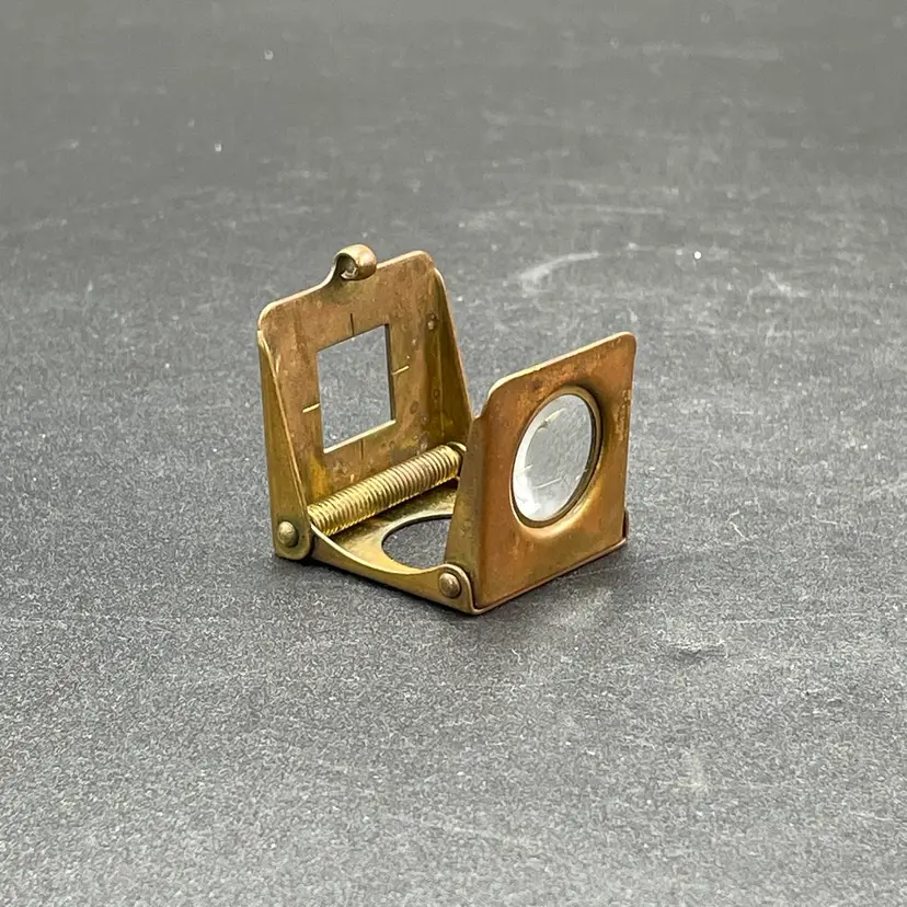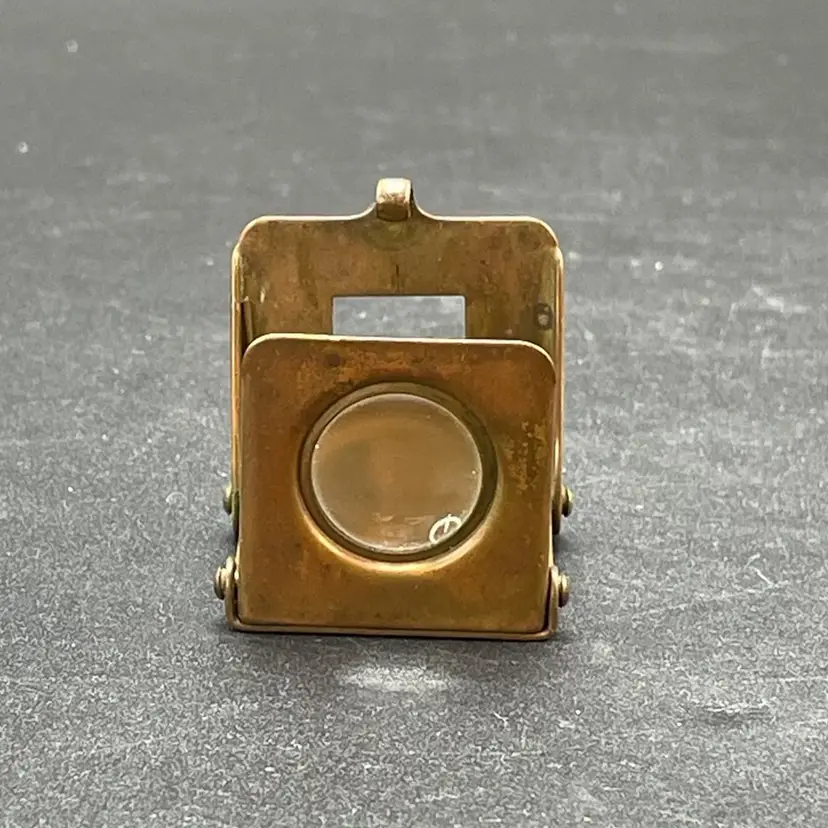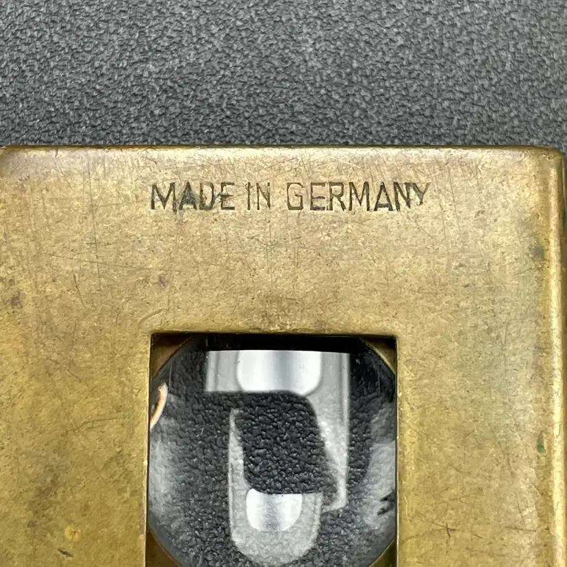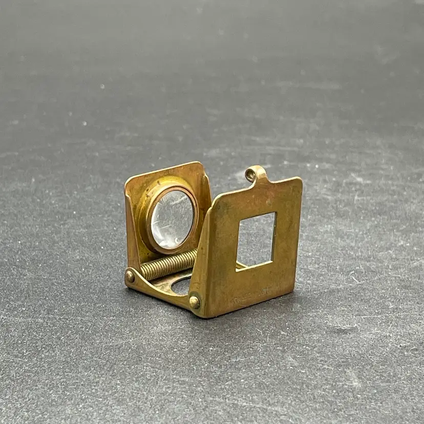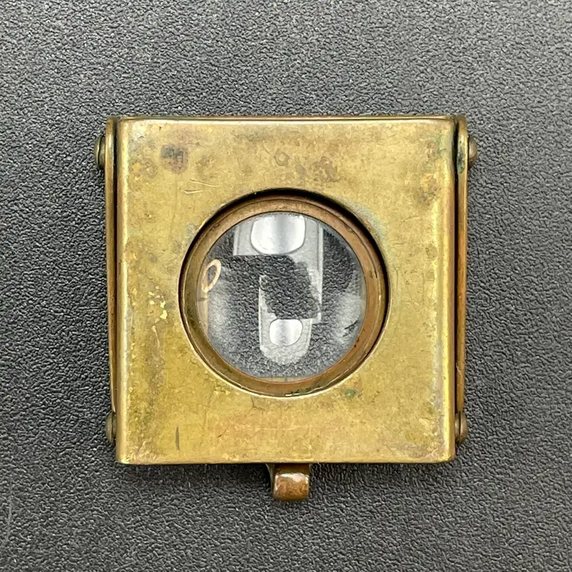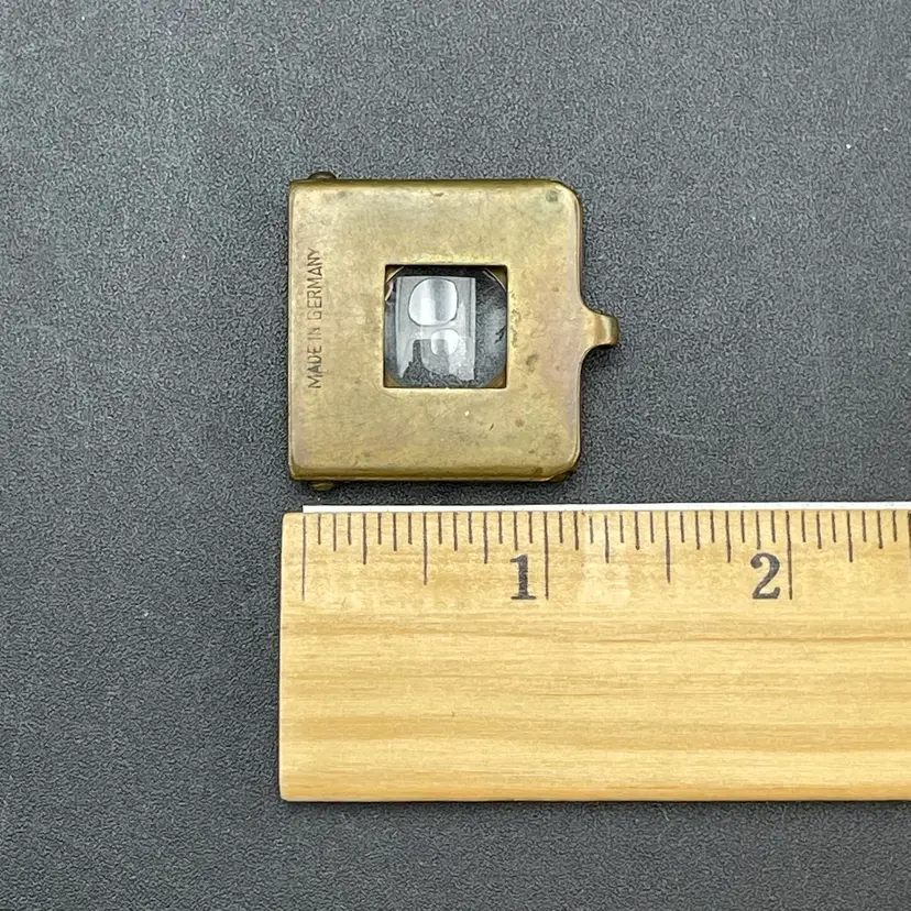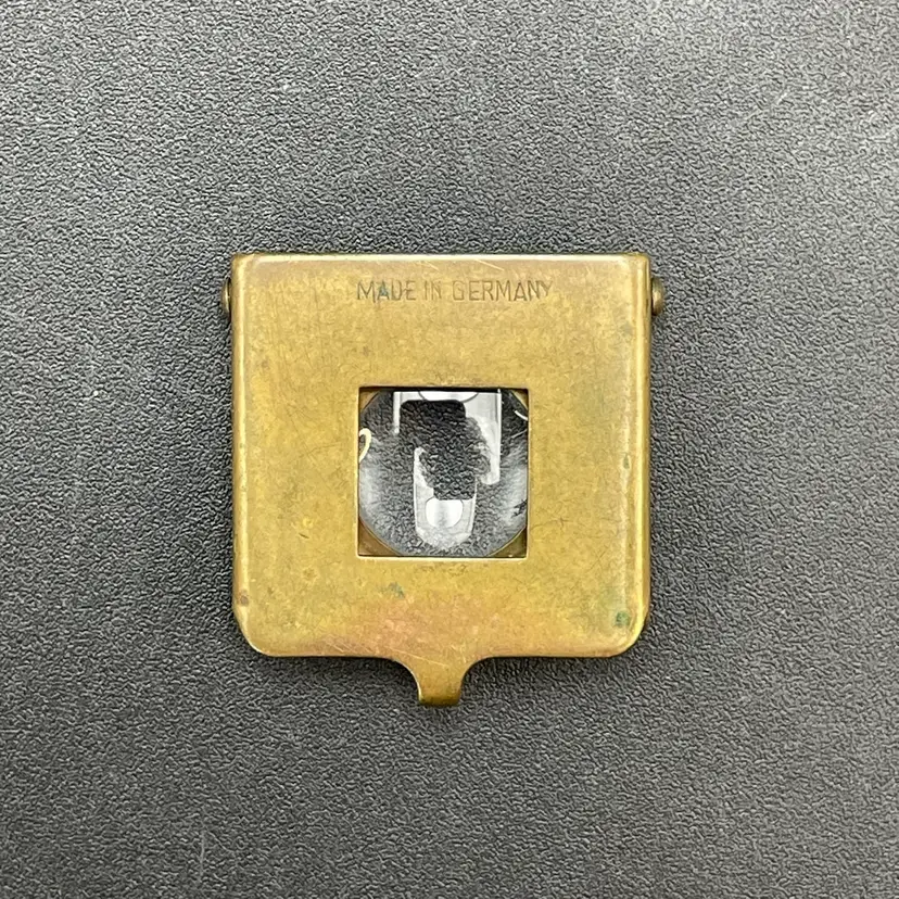 This is a vintage brass spring-loaded loupe magnifying glass. Made in Germany. Measures approximately 1" x 1" when closed. There is some tarnishing due to age. No other major flaws.