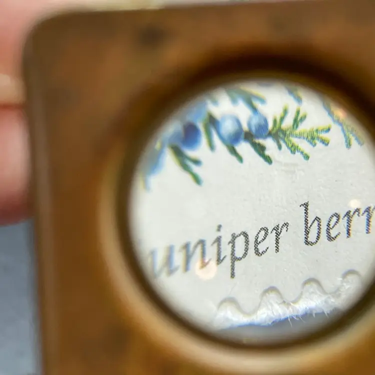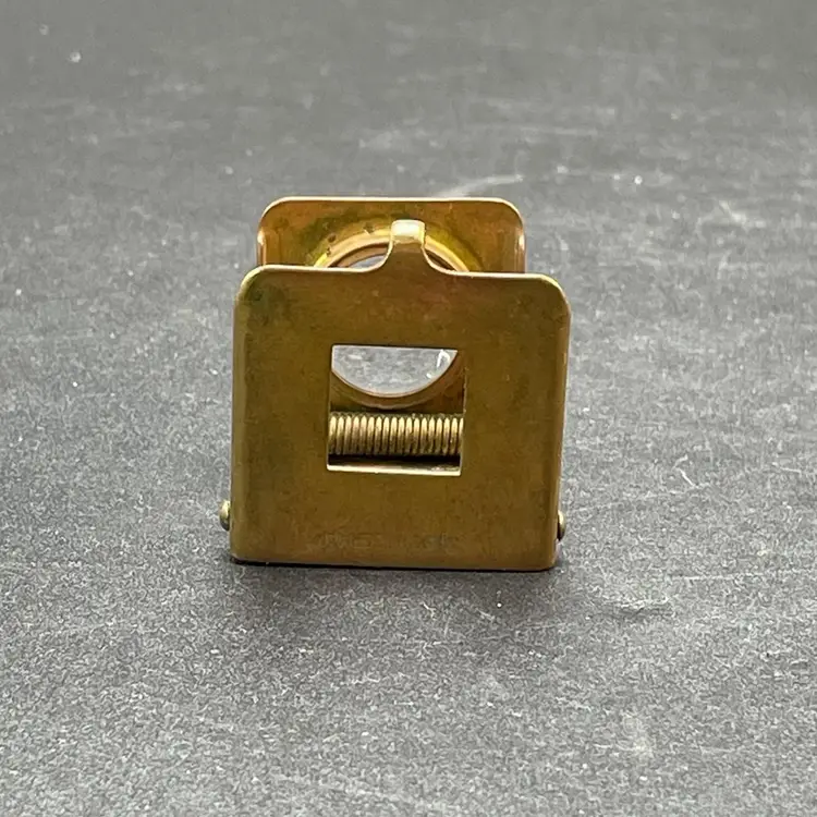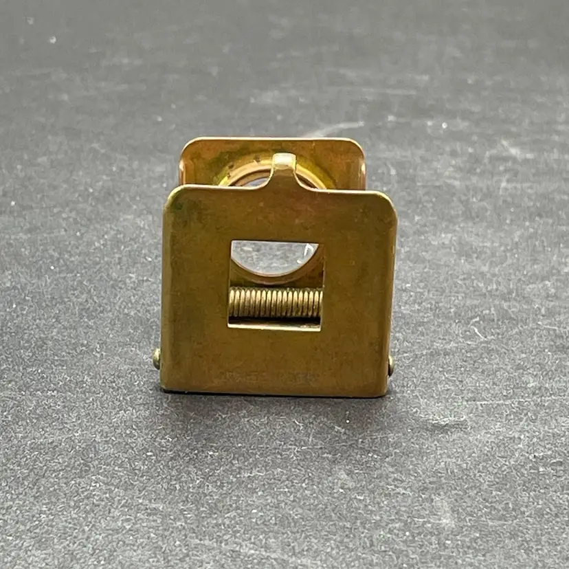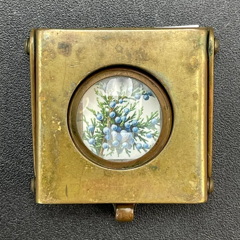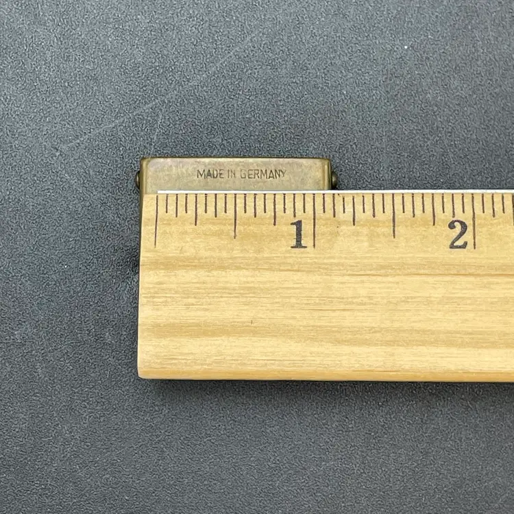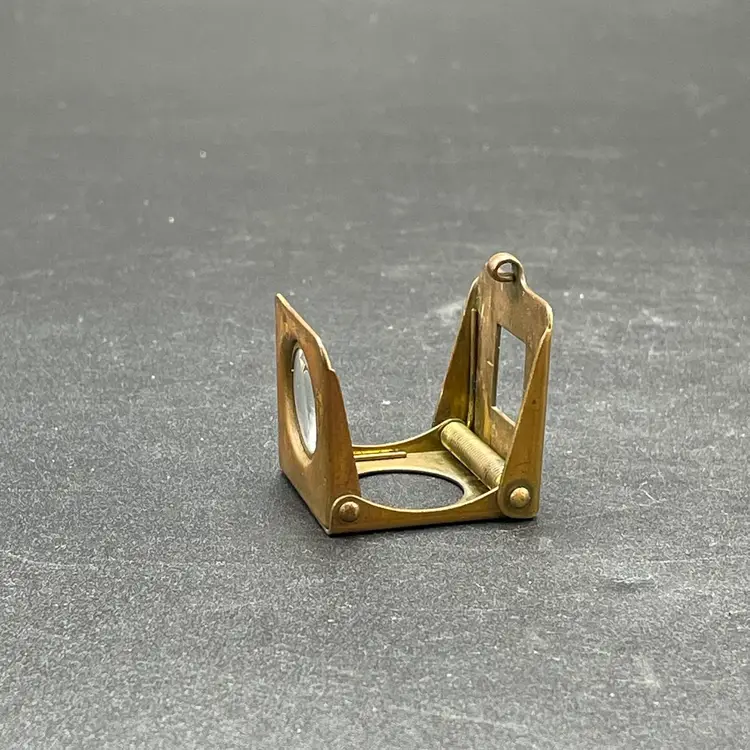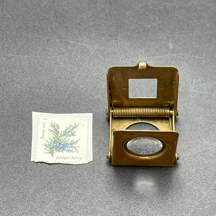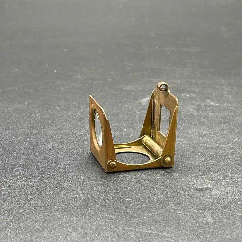 This is a vintage brass spring-loaded loupe magnifying glass. Made in Germany. Measures approximately 1" x 1" when closed. There is some tarnishing due to age. No other major flaws.