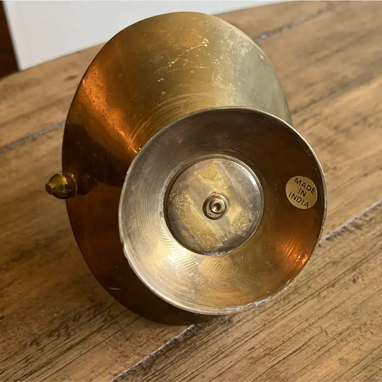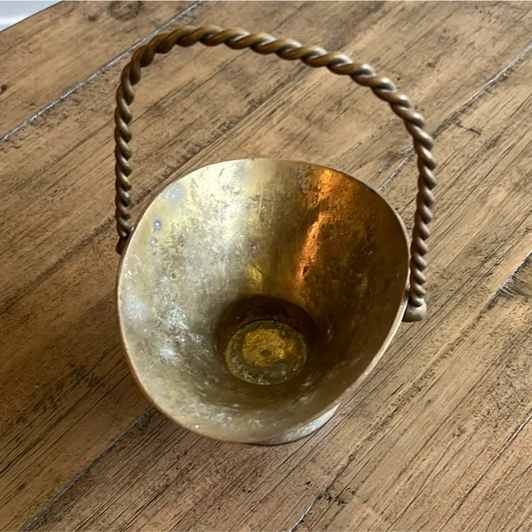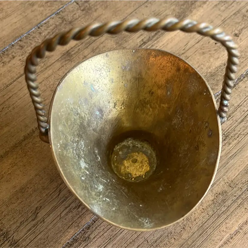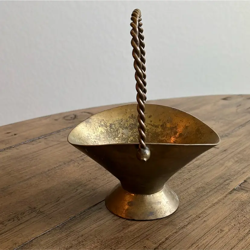 Brass handled basket with great vintage patina. Measures 5 1/2” wide 7 1/2” tall ( top of handle) and 3” deep. See photos for details of patina.