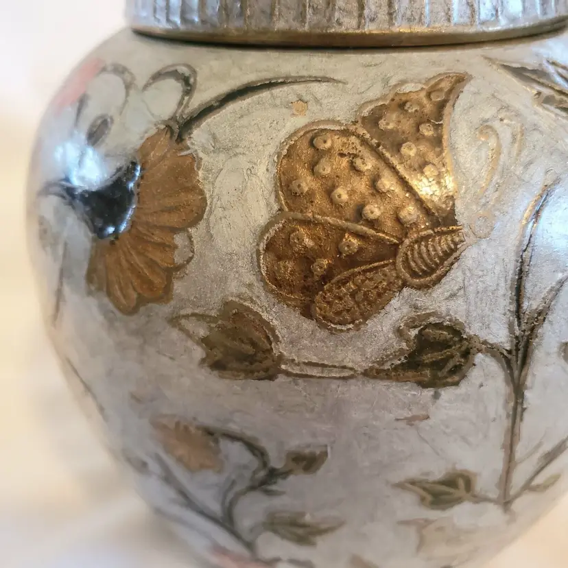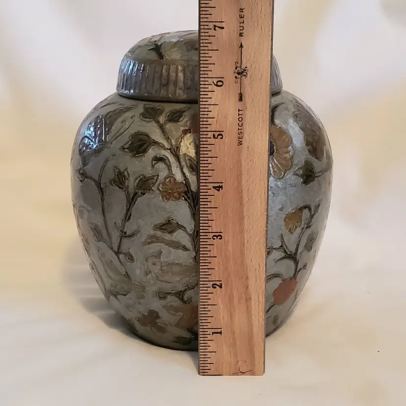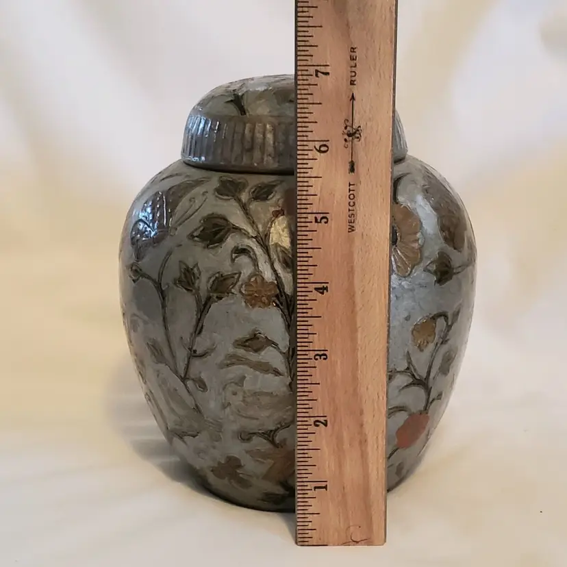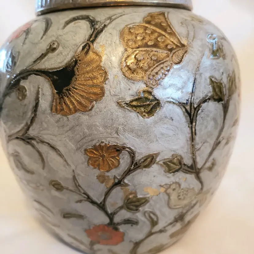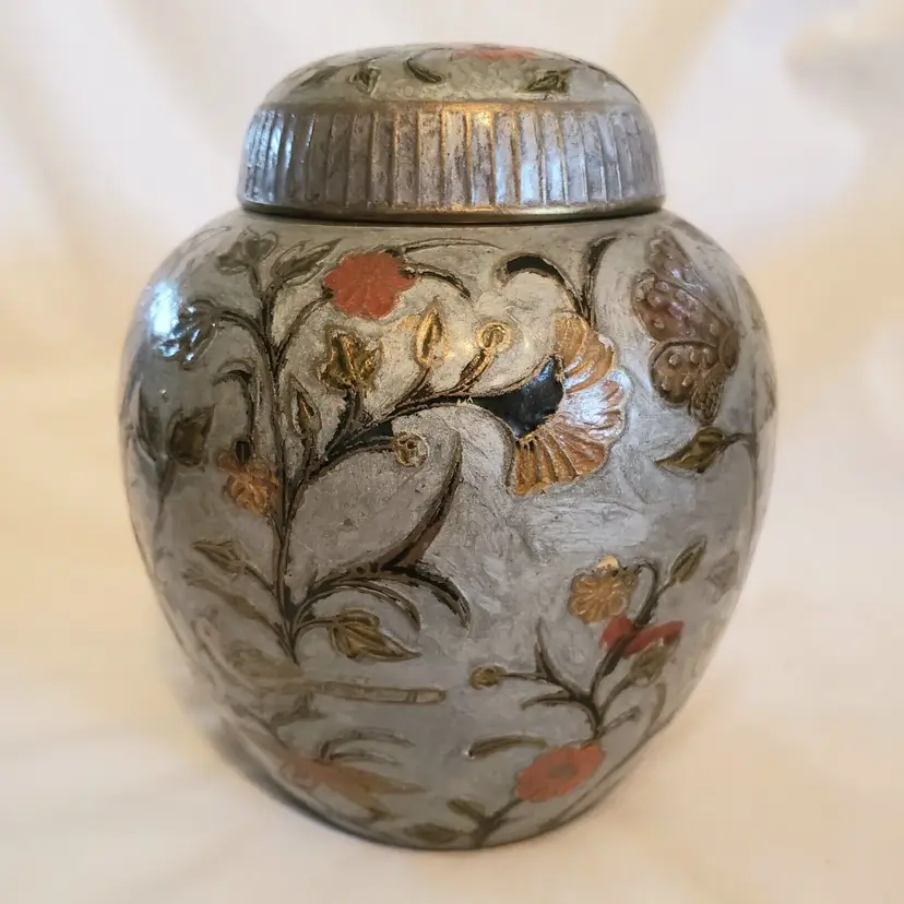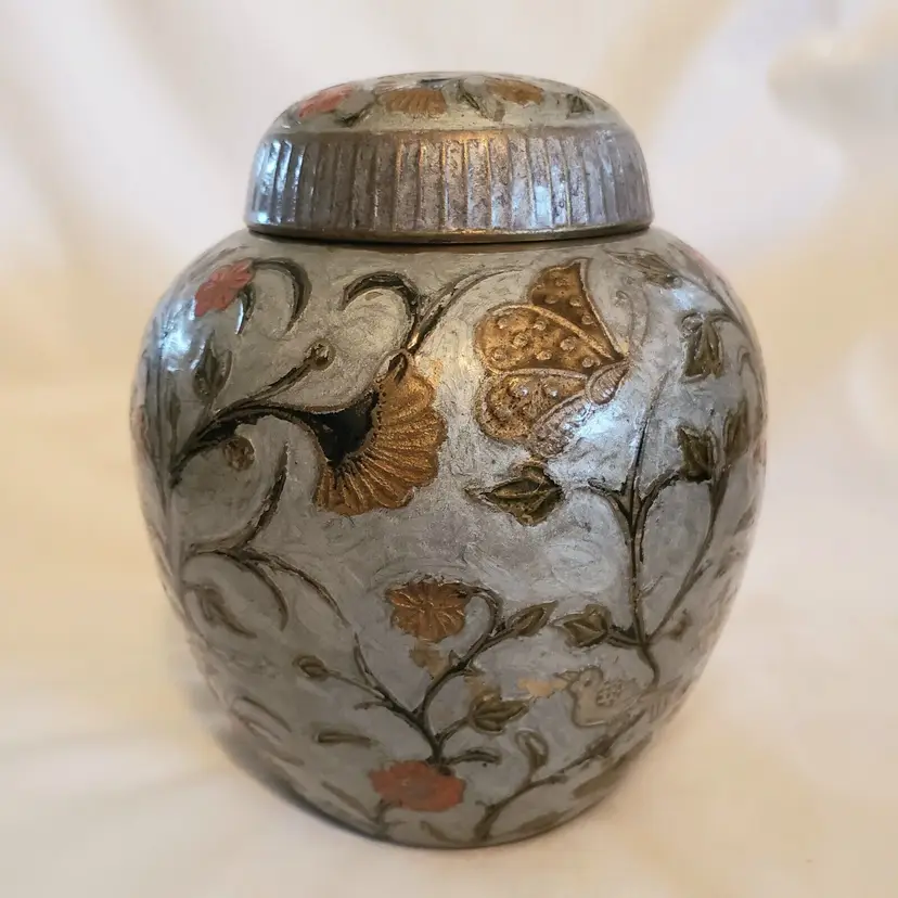 Brand: Ginger Pattern: Floral Type: Jar Color: Orange Material: Brass Item Length: 7 in Country/Region of Manufacture: India Finish: Gold Subject: Bird (596)
