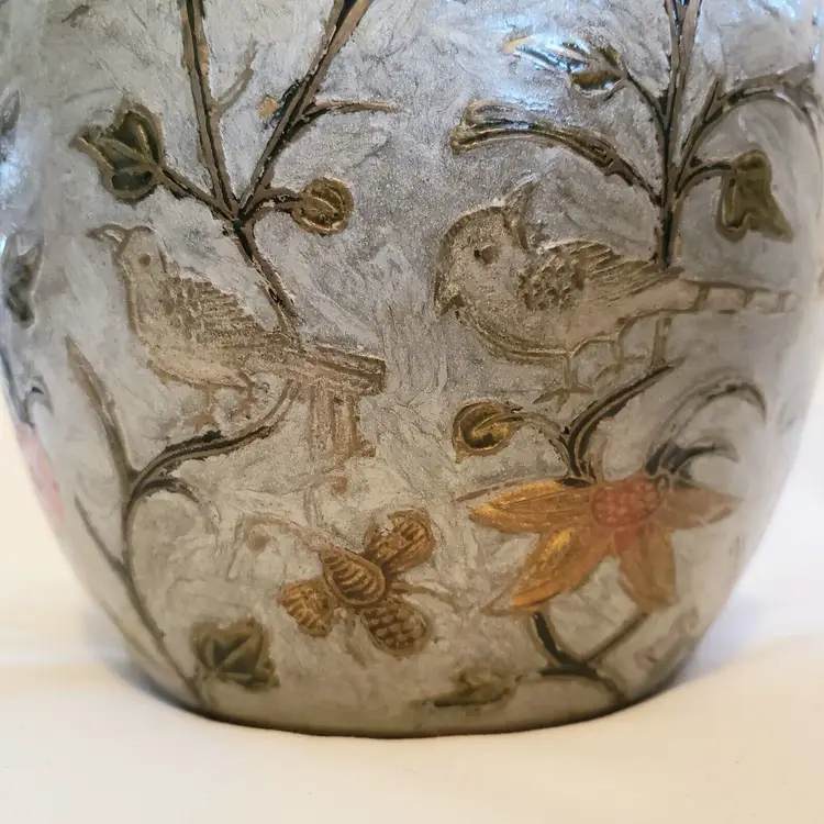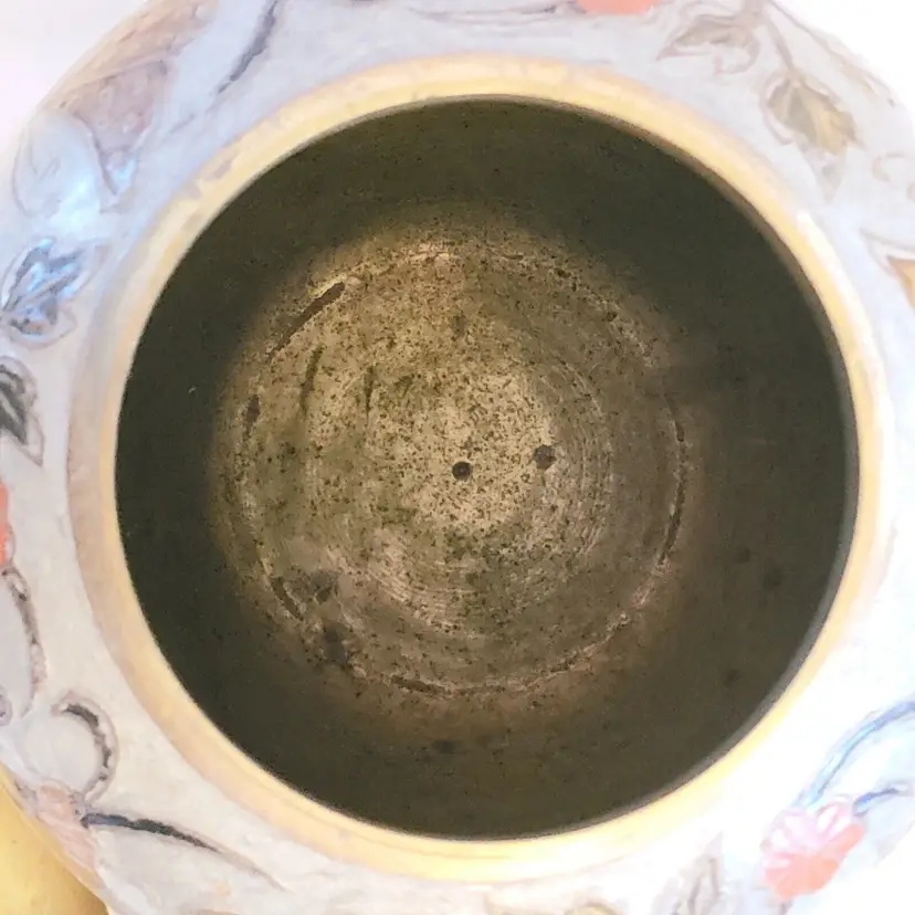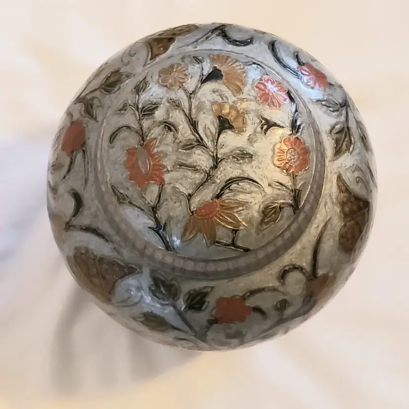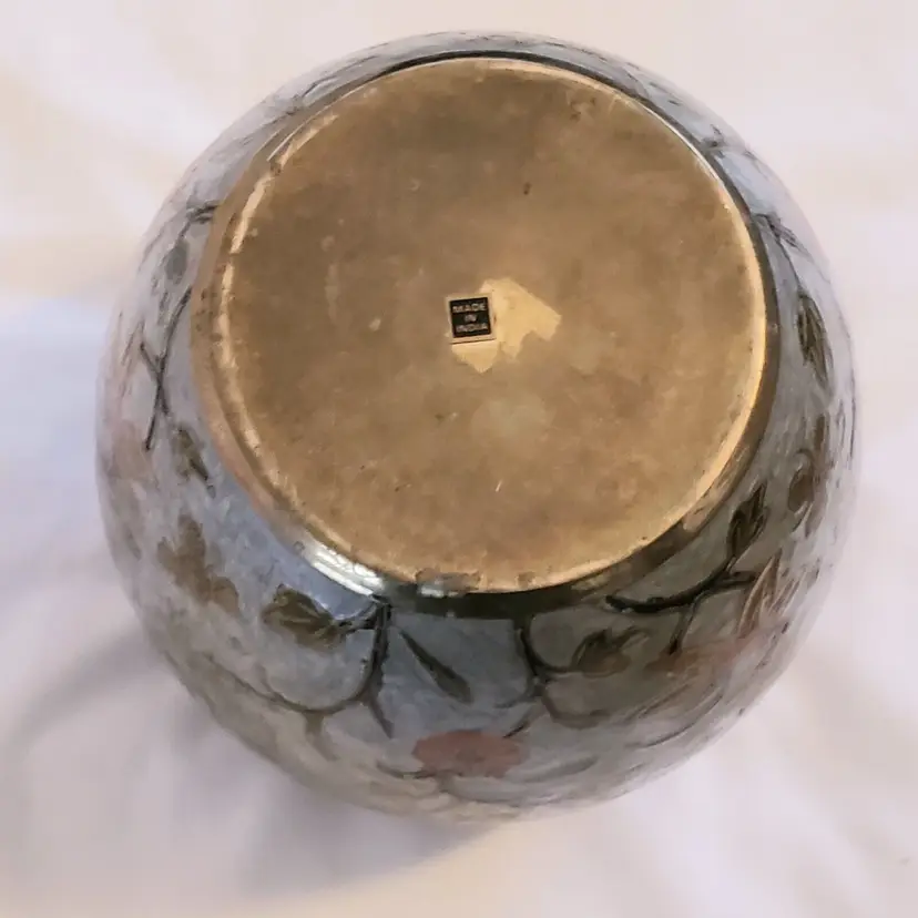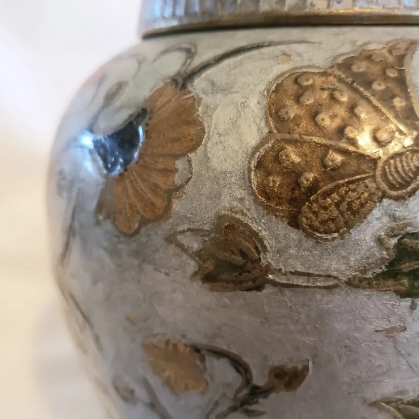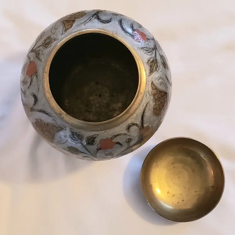 Brand: Ginger Pattern: Floral Type: Jar Color: Orange Material: Brass Item Length: 7 in Country/Region of Manufacture: India Finish: Gold Subject: Bird (596)