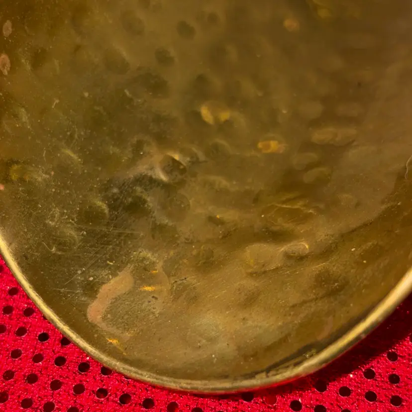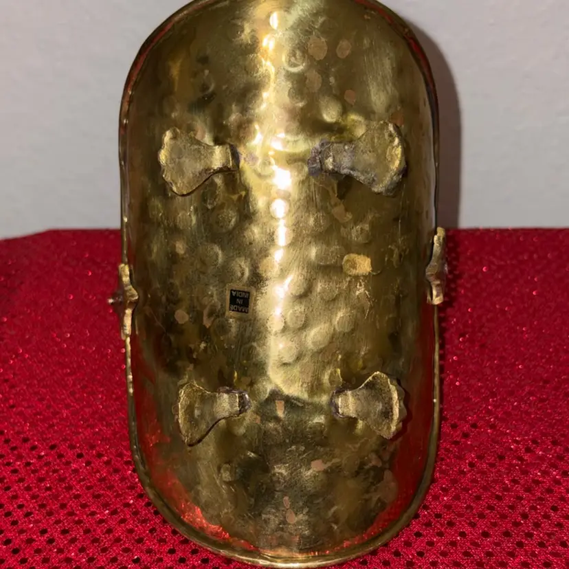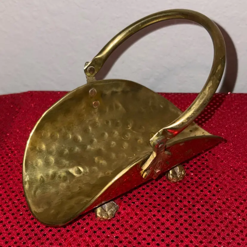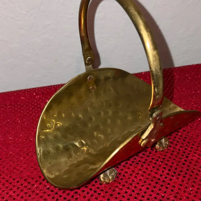 This is a vintage mini hammered brass fireplace log or firewood holder/basket. The item is made of hammered brass with a high shine finish. It features an adjustable handle and sits on decorative feet. Similar items are often used as decorative home accents, such as vanity holders for small items or simply as vintage decor.
