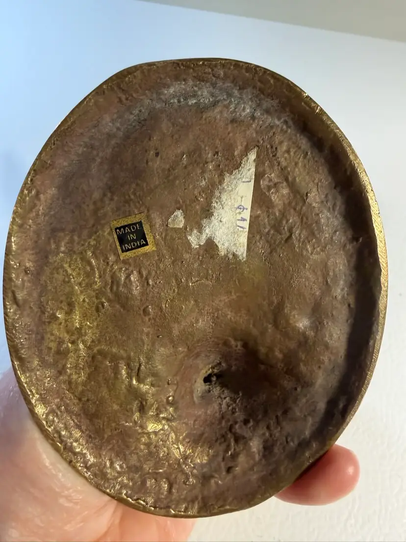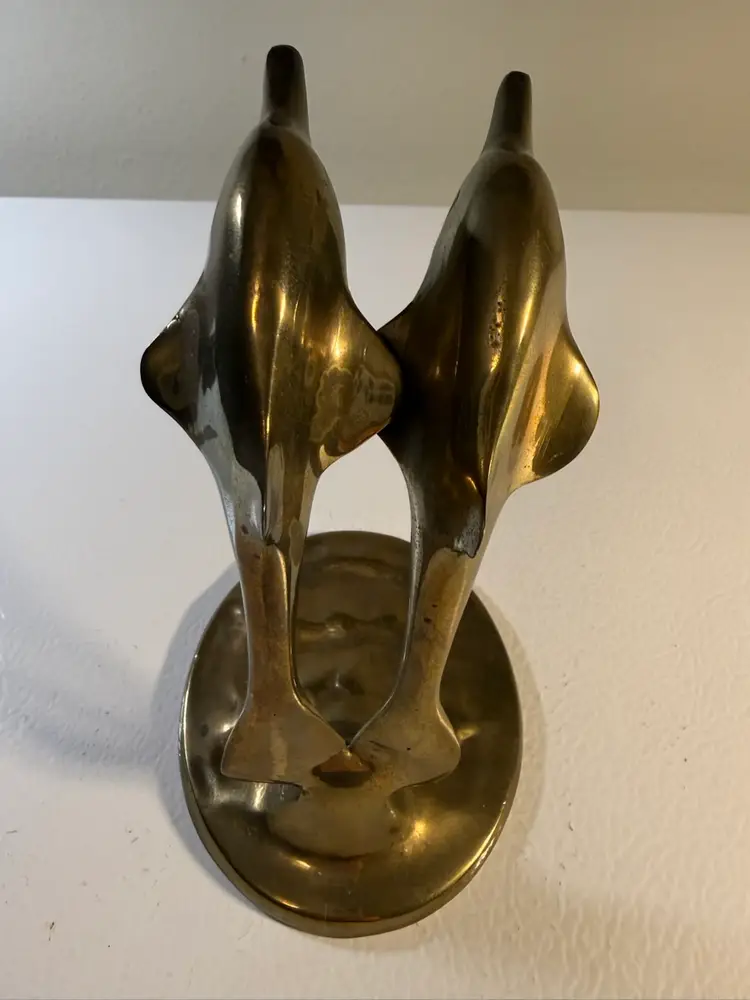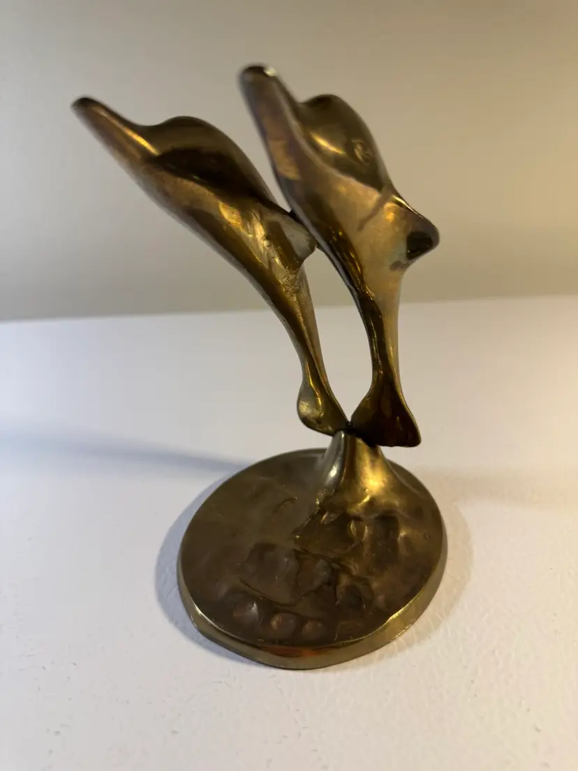 This item is a vintage brass figurine featuring two dolphins swimming together.