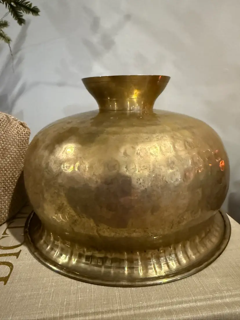 This exquisite vintage brass bowl/pot showcases a magnificent rich patina, indicative of its age and history. Perfect as a decorative centerpiece, a unique planter, or simply an intriguing accent piece for any home. The pot features a rounded body and a distinctive hammered texture that catches the light beautifully, highlighting its unique character. Its timeless appeal makes it a versatile addition to various decor styles, from rustic to bohemian or eclectic. Excellent pre-owned condition, with natural signs of aging and wear that enhance its vintage charm.