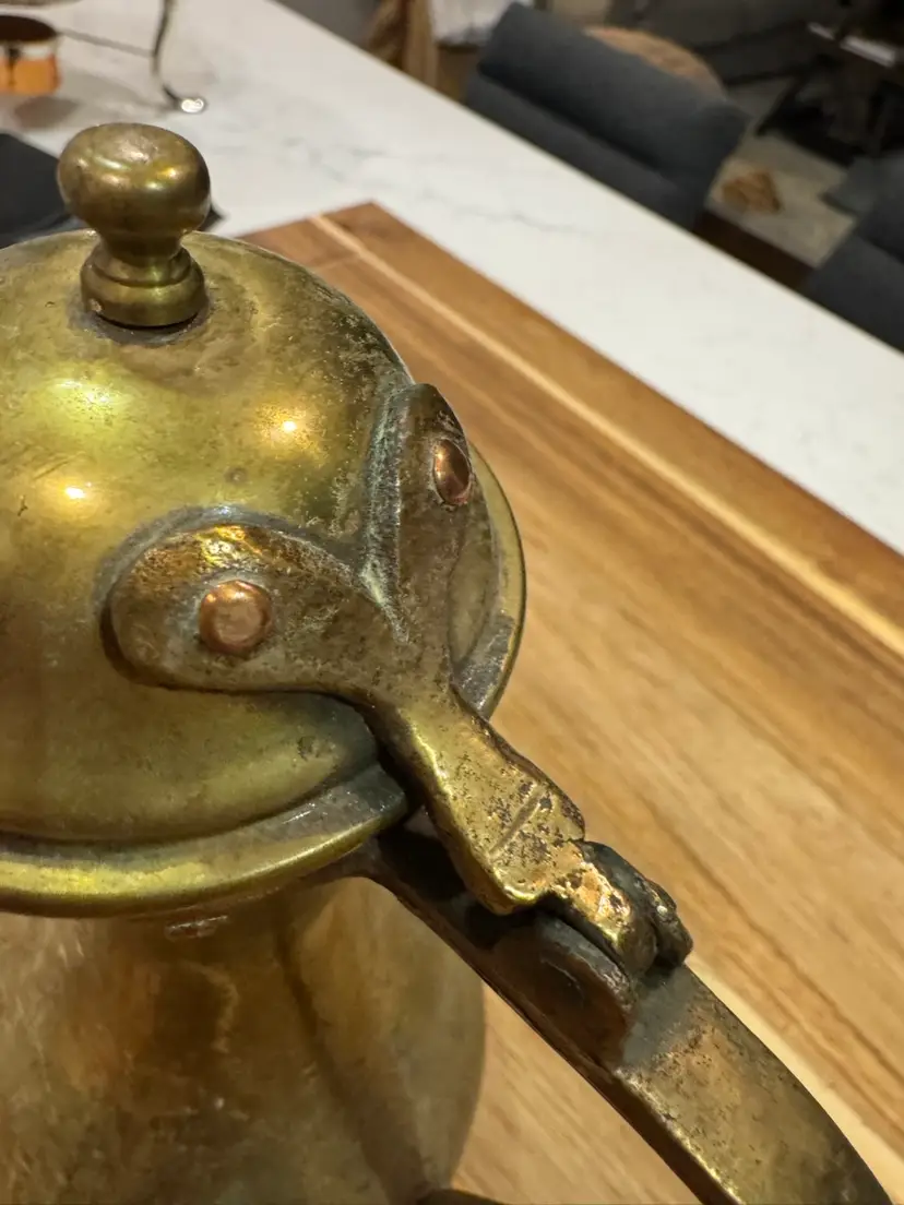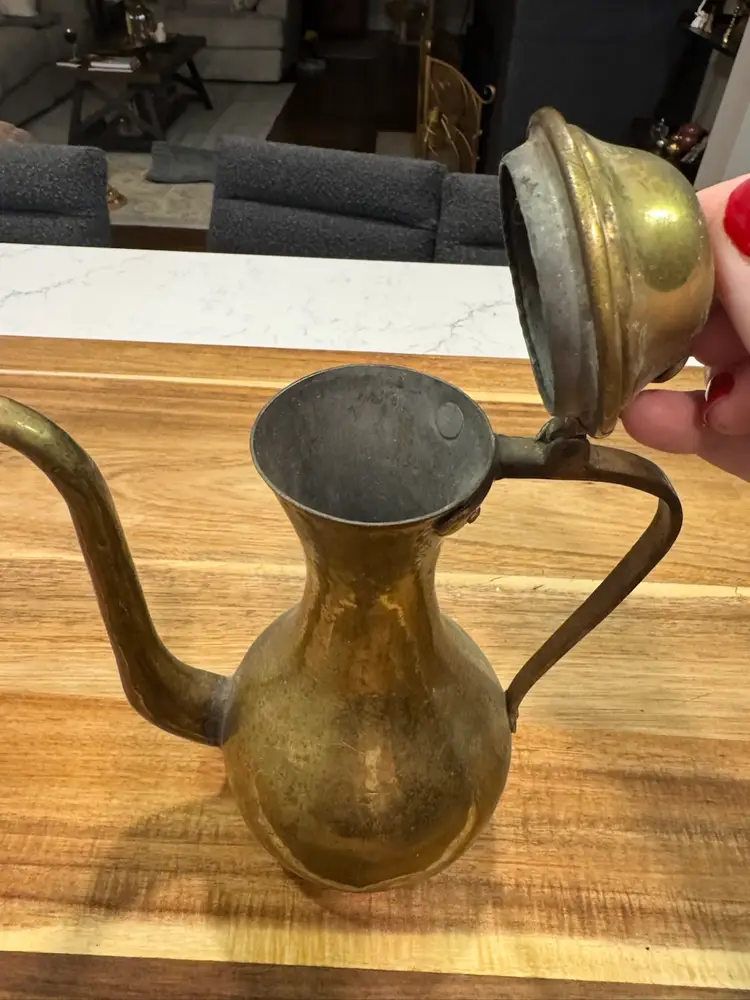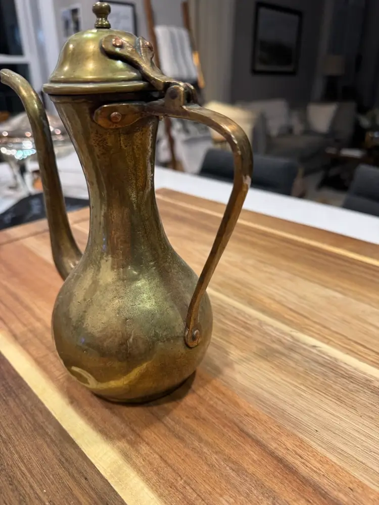 Vintage hammered brass pitcher with hinged lid and long spout. Middle eastern, mid century