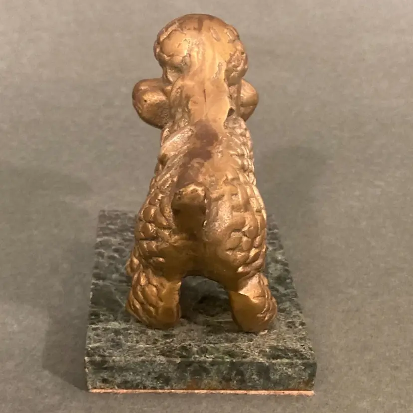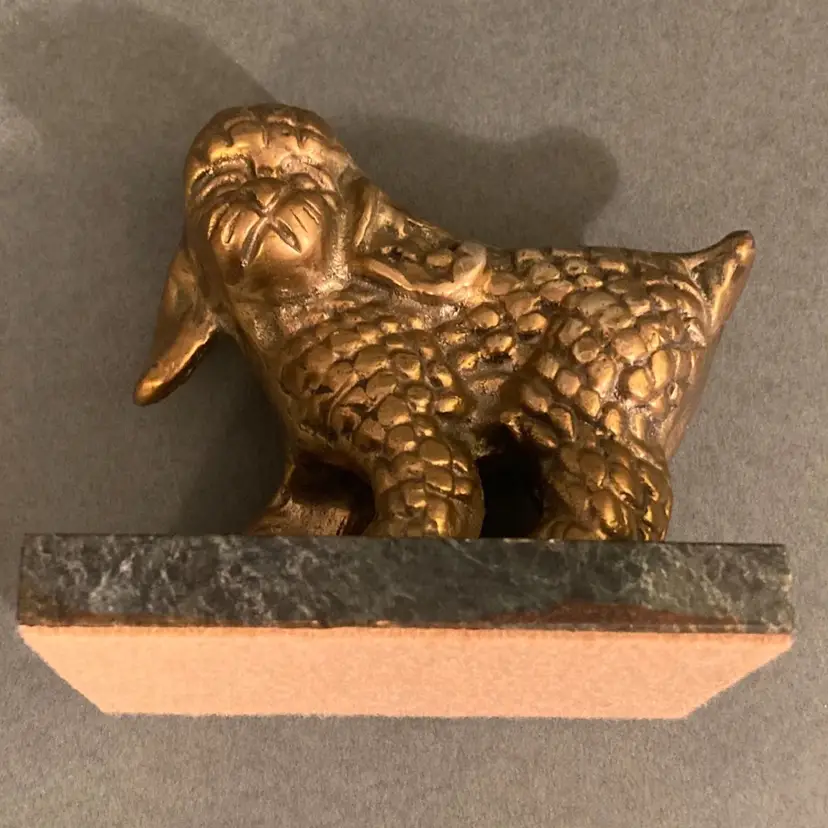 This cute little brass poodle is available for adoption! It is in very good vintage condition. I added some fresh adhesive felt to the bottom because the original felt was dirty and peeling off. There is some minor rust-like discoloration on the base (see photos) but it is not very noticeable and could probably be cleaned. The base measures 2.5” by 3.5”. This item weighs more than a pound, which seems quite heavy for its size!