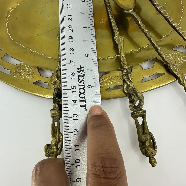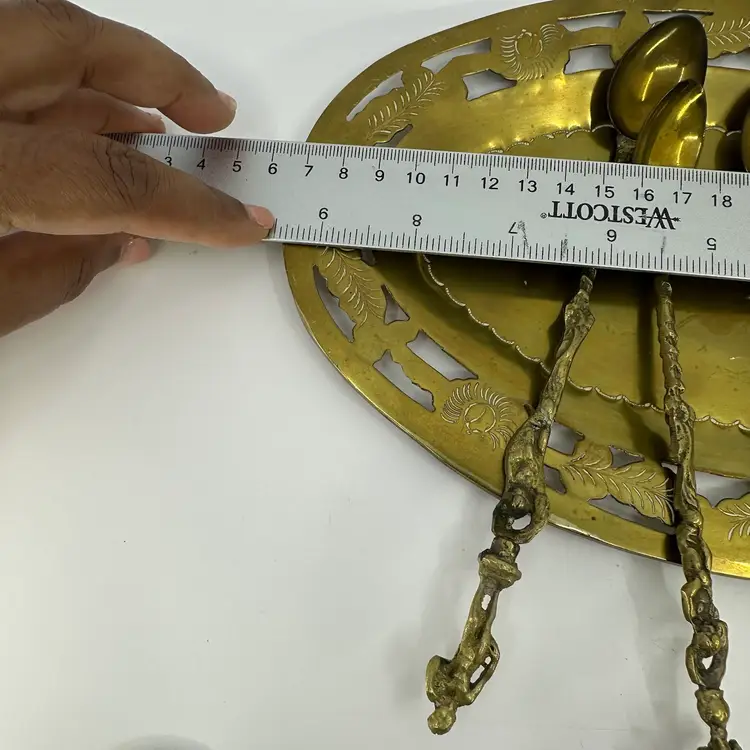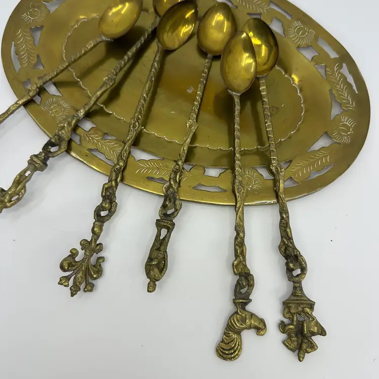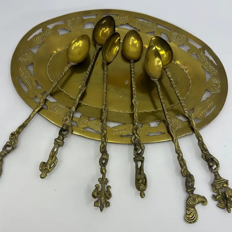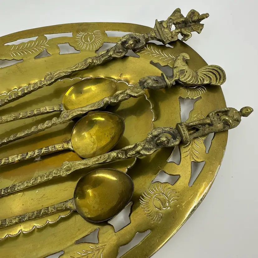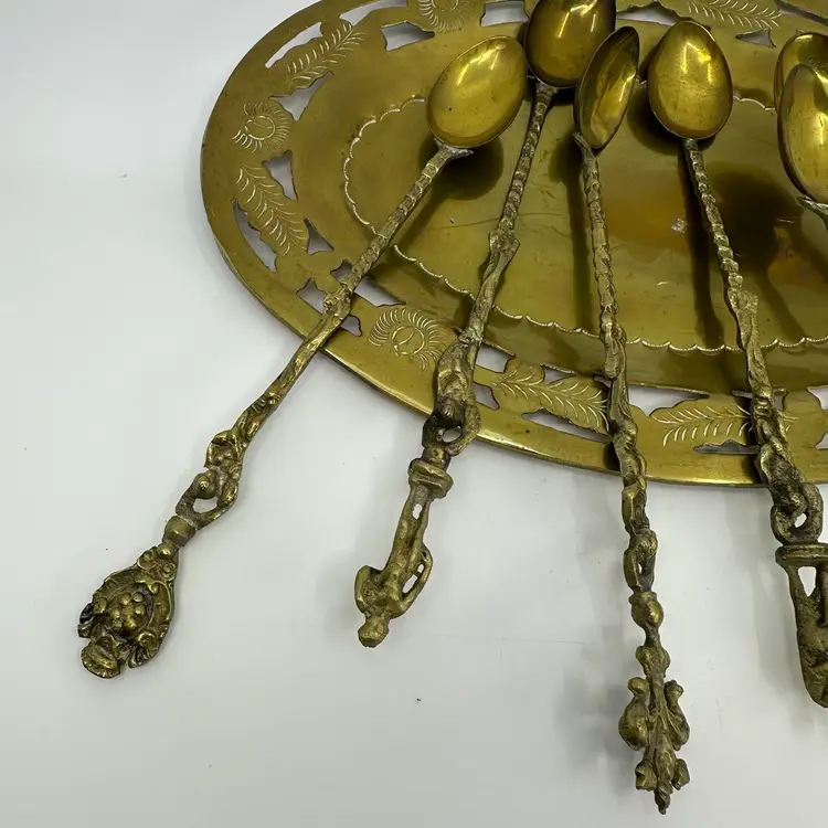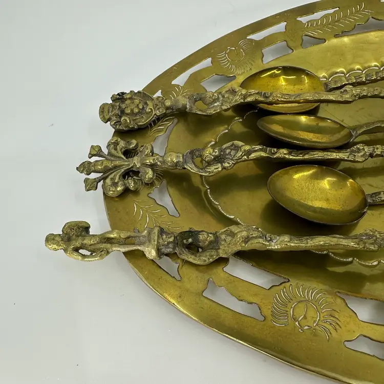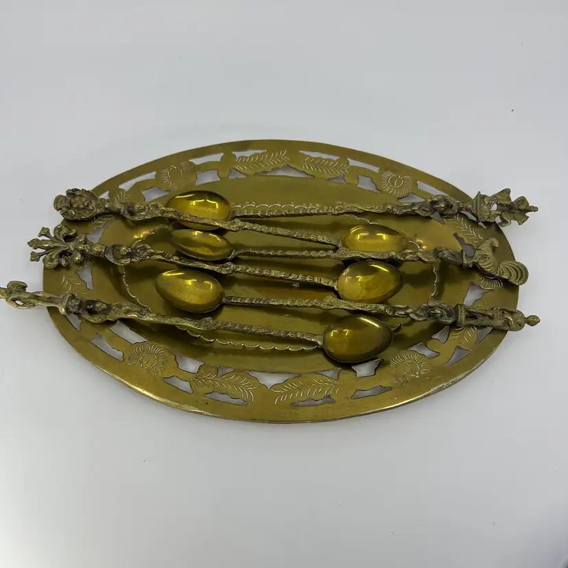 Spoons are 7.5” long and tray is 9.5” x 6.5” some patina, good condition