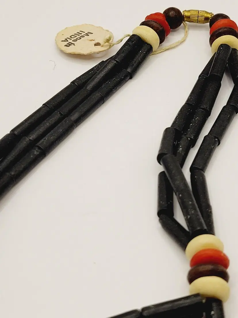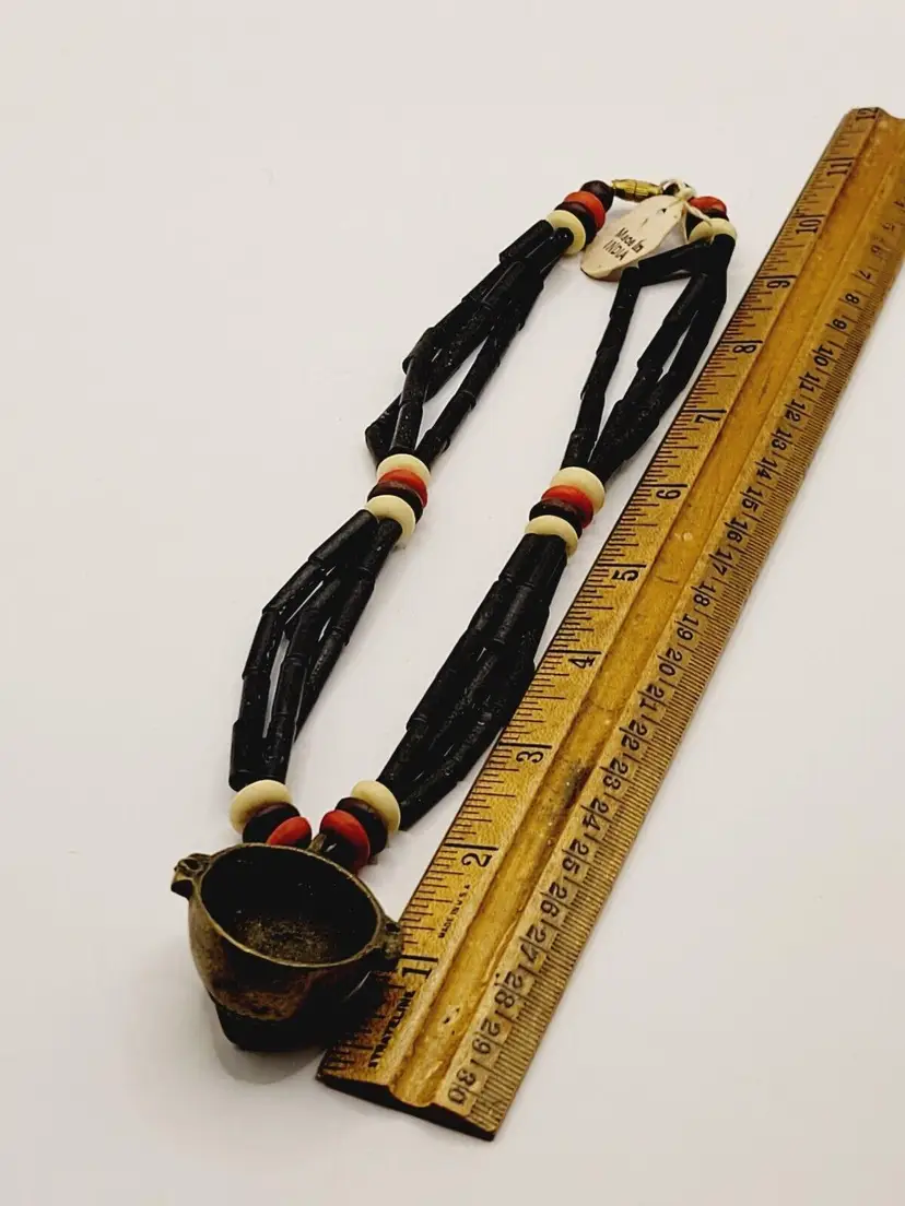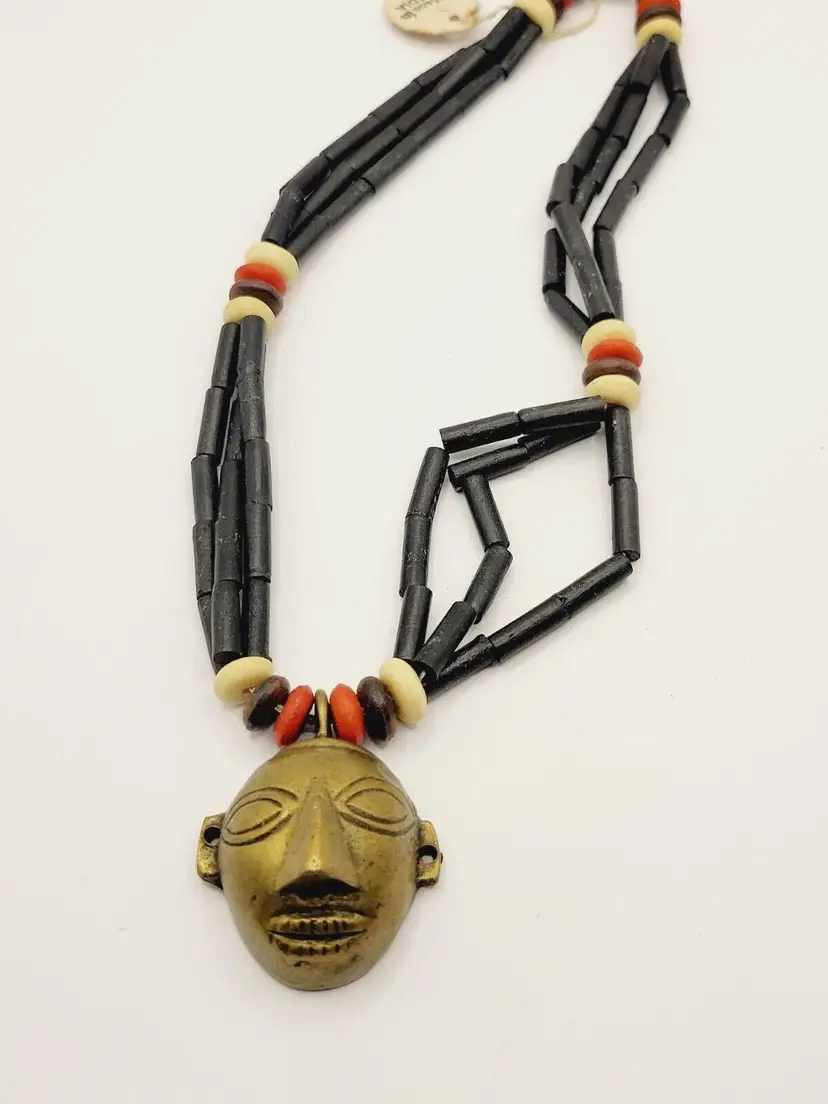 Beautiful beaded necklace with brass pendant in the shape of traditional tribal mask. Made in India. Not sure what exactly the beads are. Secured with barrel clasp. This one has the tag marked India. Look at my other listing of this in green.