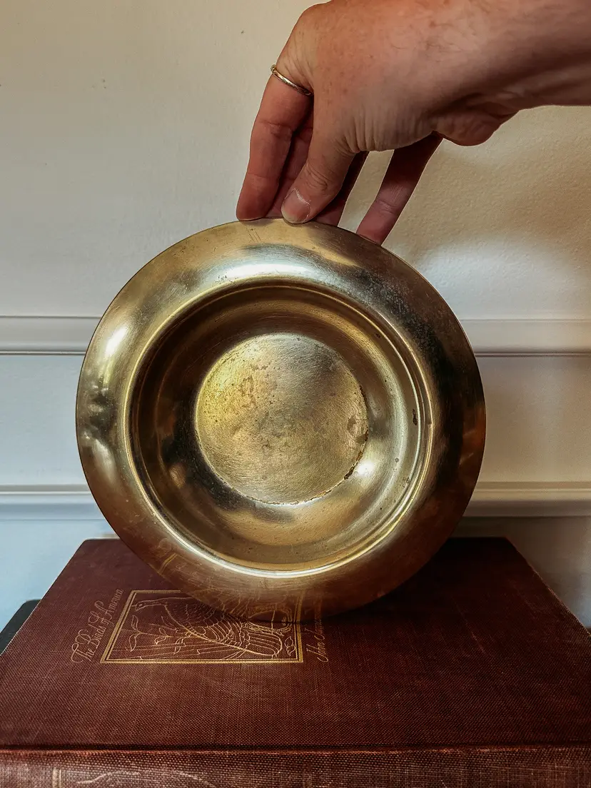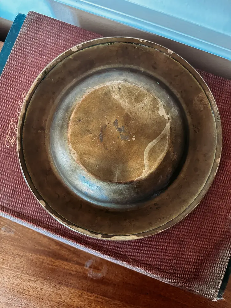 slightly dented as can be seen in the images. slight bowl shape almost like a small offering plate. Classic timeless style that would look beautiful styled in so many ways! Shows beautiful vintage patina. Approx 9" in diameter.