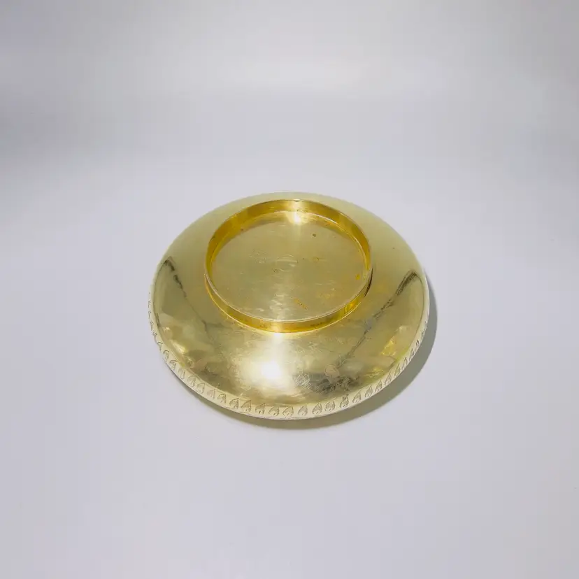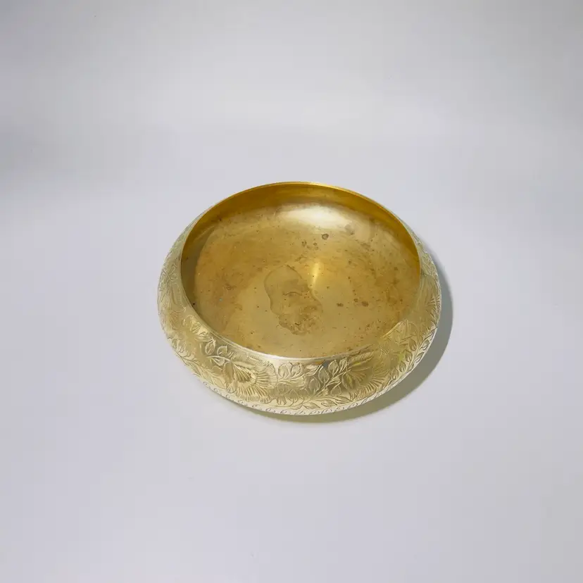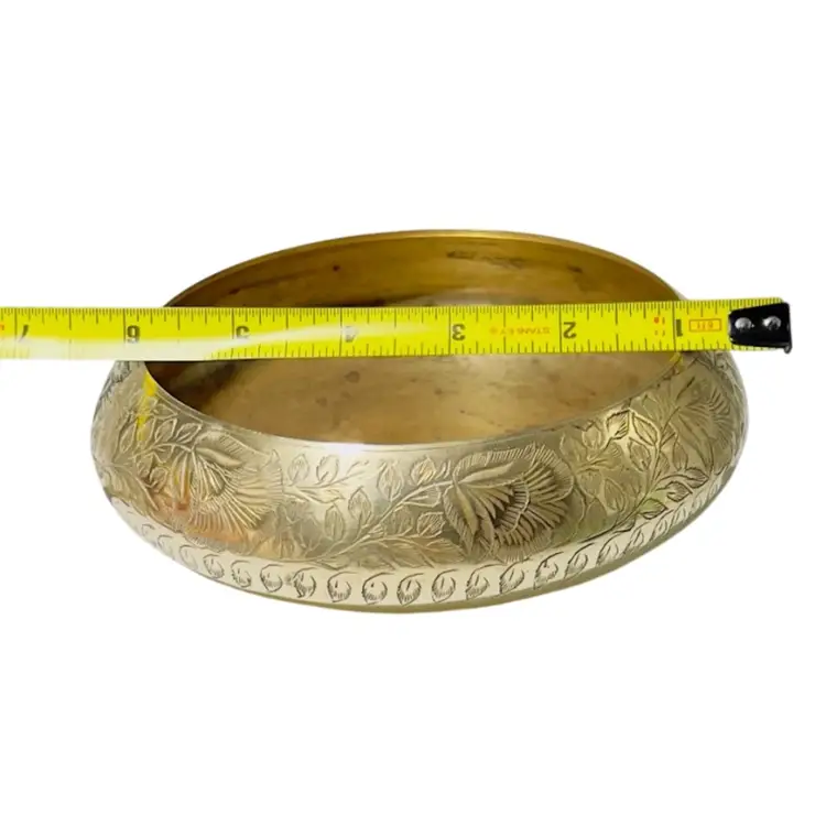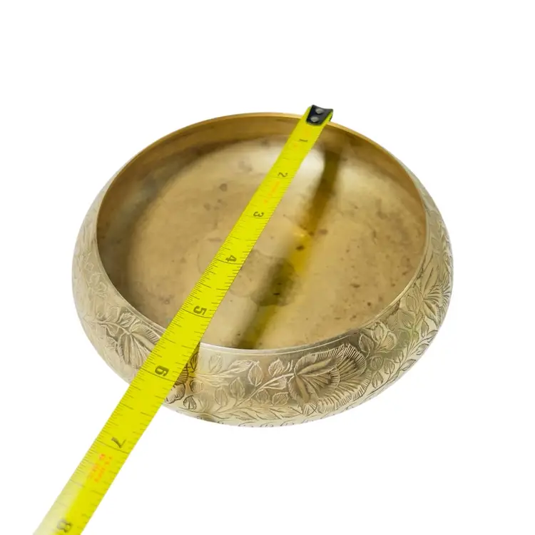 This is an Engraved brass urli bowl. Urli bowls are traditional South Indian decorative vessels, often used for Hindu rituals and ceremonies. They are typically filled with water and adorned with floating flowers, petals, or candles. The intricate floral and leaf patterns on the side are handcrafted through techniques like embossing and etching. As per Vastu Shastra principles, urlis filled with water are considered auspicious and believed to attract wealth, luck, and prosperity to the home. 👉6”L x 2 1/2“W x “D 👉Shipping Overages <$1 Refunded 👉No Chips or Cracks 👉 Review Photos for Best Condition Description 👉 Sold as Shown