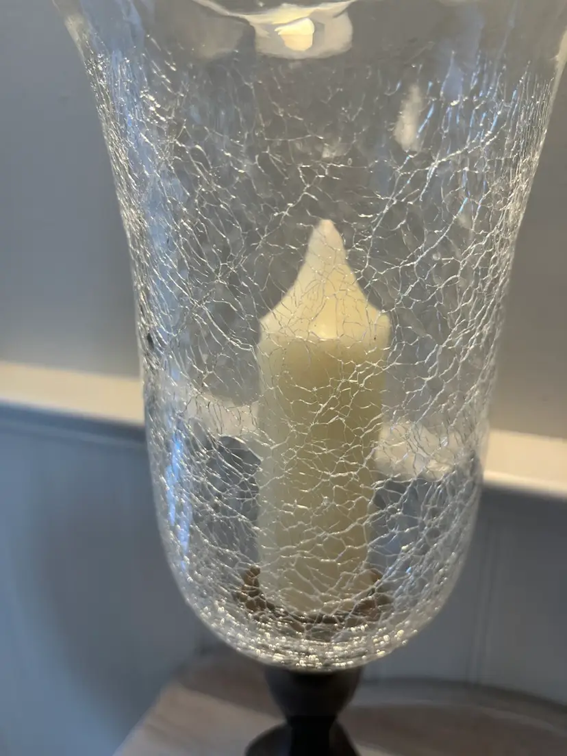 Set of brass ram head taper candle holders with crackle glass. 15” H