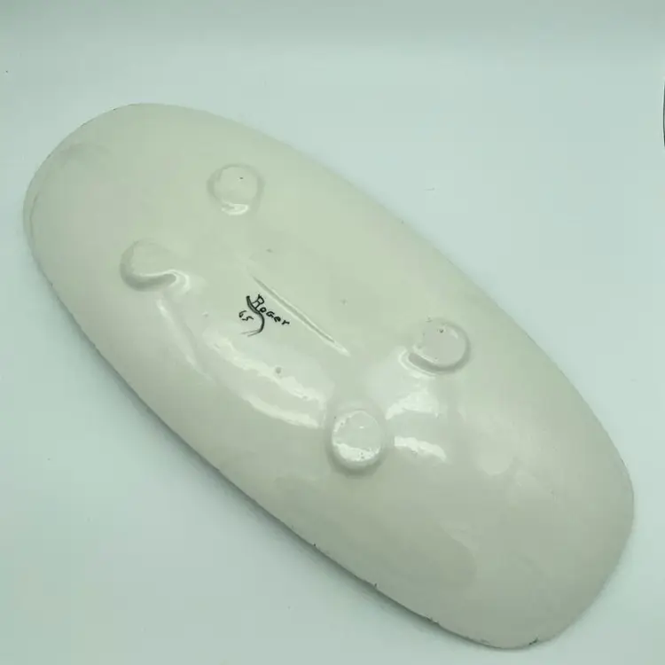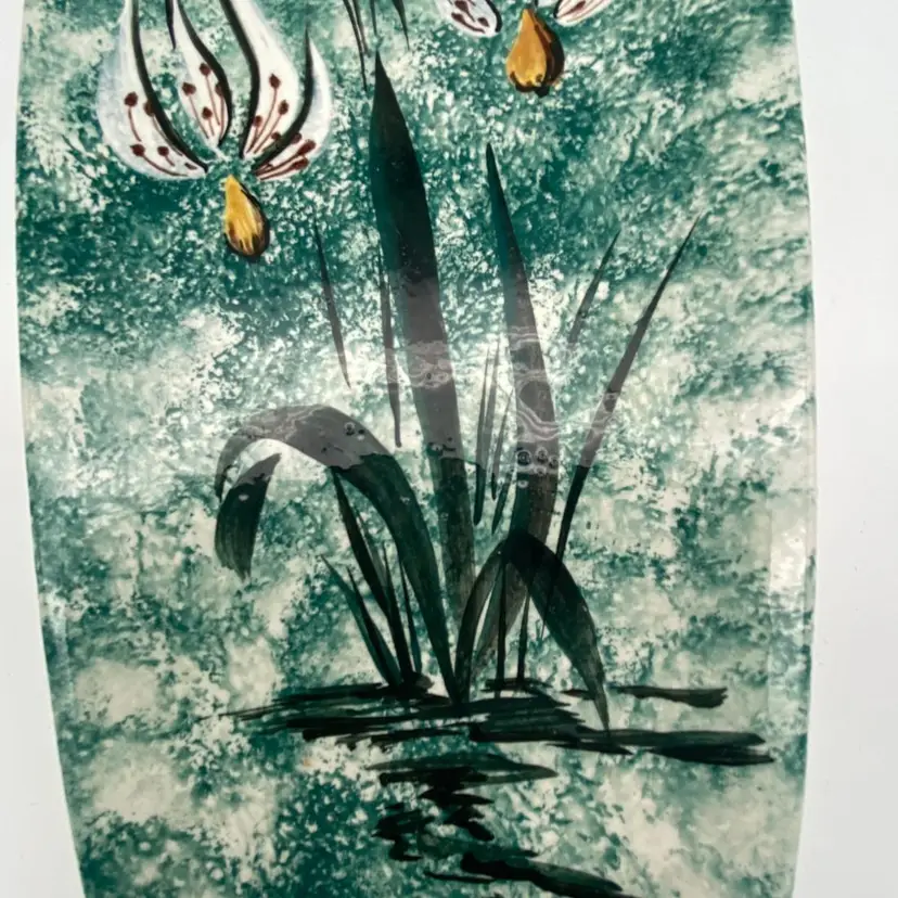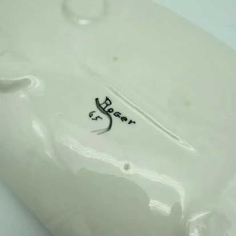 The painting on this @14" tray was done by someone named Roger in 1965 according to the bottom marks. Tray is in excellent condition, no chips or cracks. Painting is in the style of Sascha Brastoff. This is likely a hobbyist piece but if you judge by the artwork it is a very professional job.