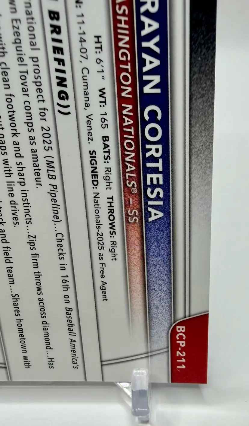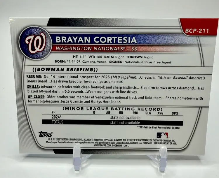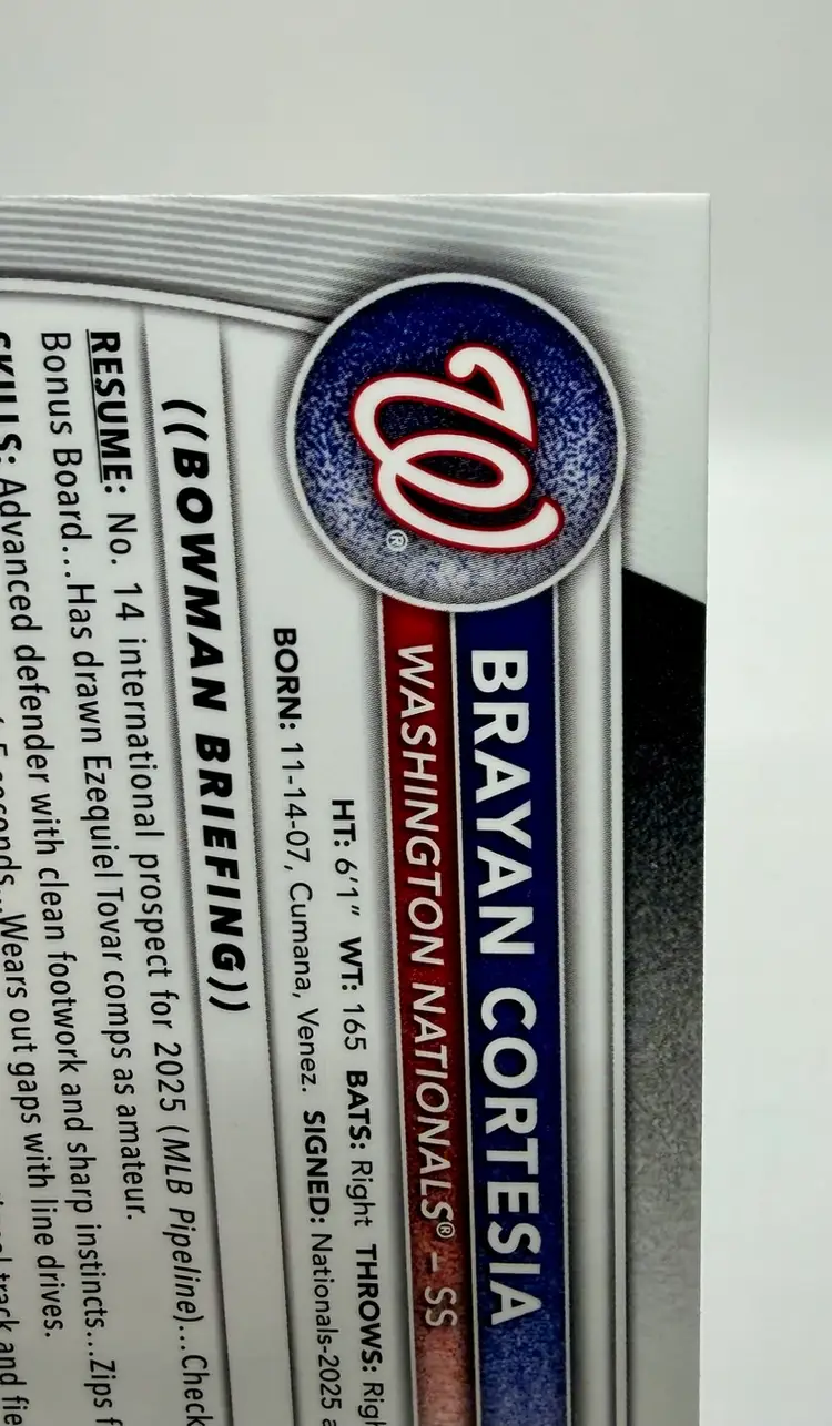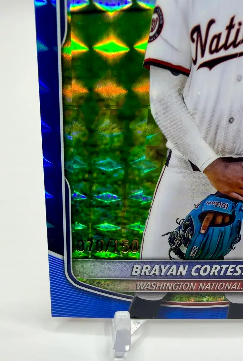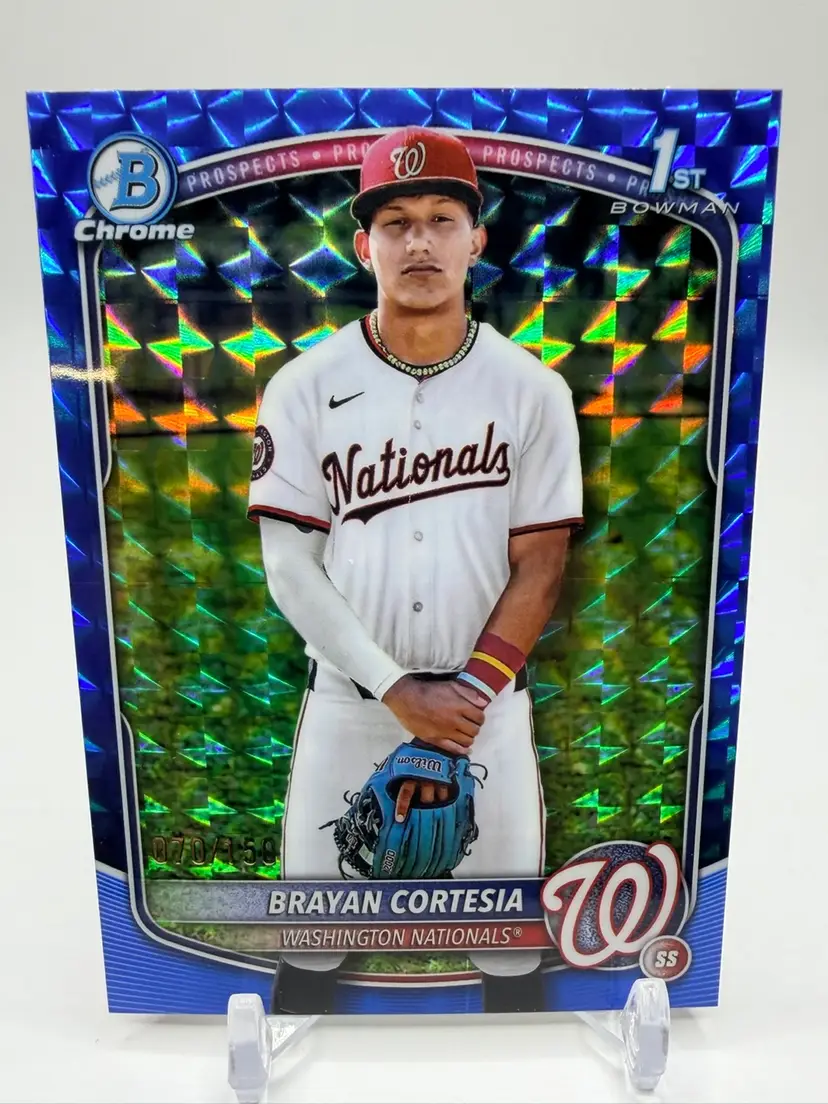 2025 Bowman Chrome 1st Blue Geometric Nationals trading card featuring Brayan Cortesia of the Washington Nationals. Please review the photos carefully to assess the condition of the cards. We do our best to provide clear, detailed images, especially for cards with noticeable flaws. Please note that some raw cards may show light wear, so we encourage close inspection. Cards will be shipped securely Thank you for checking out our store and for your support!SKU: 844