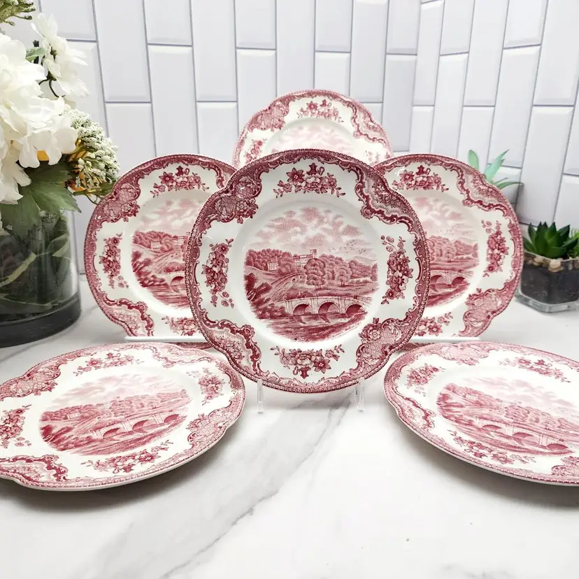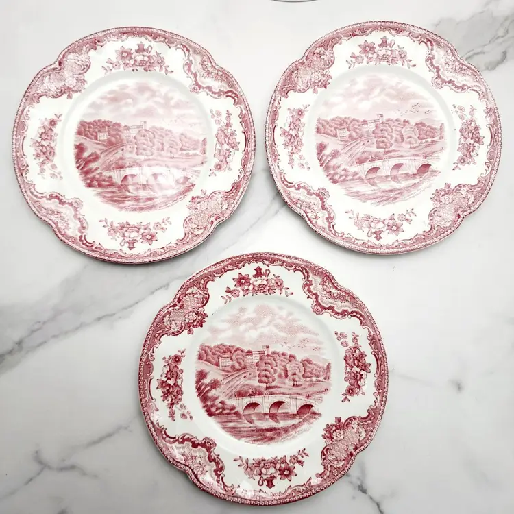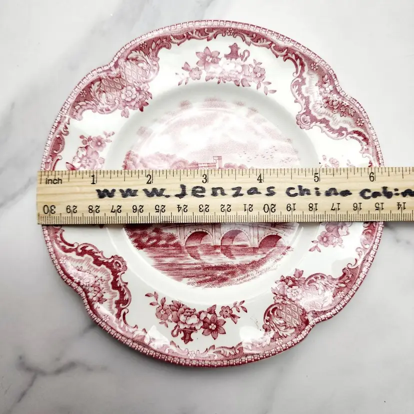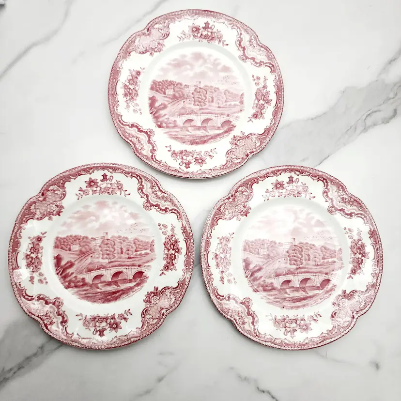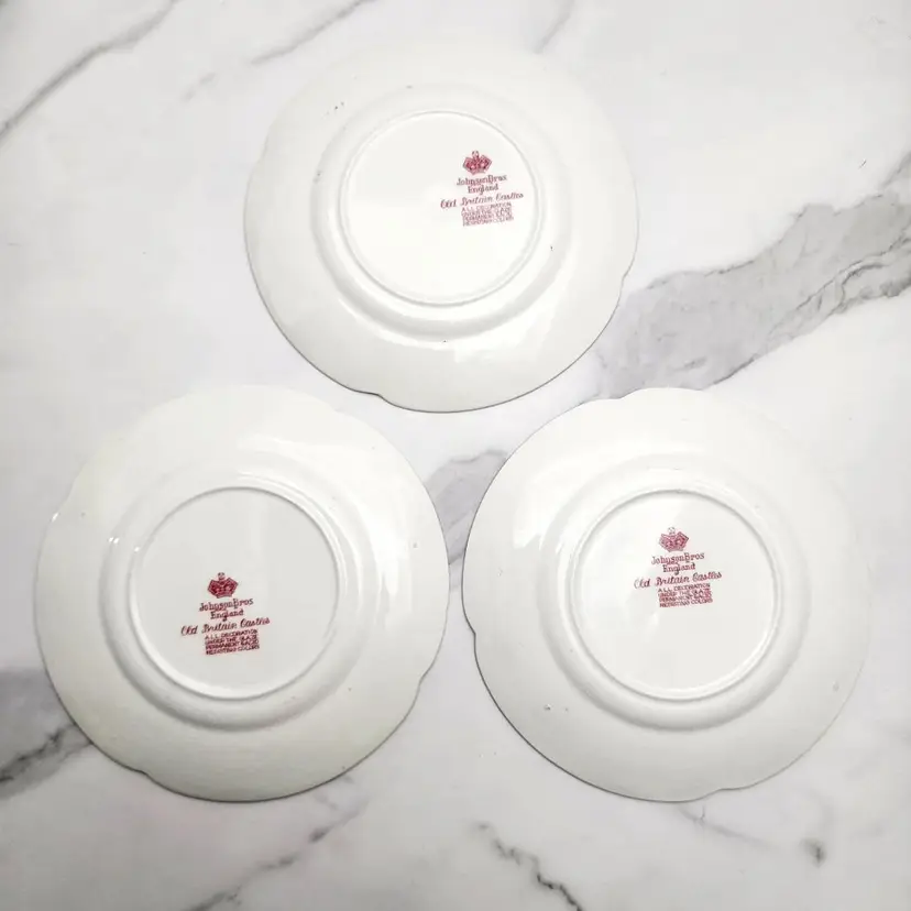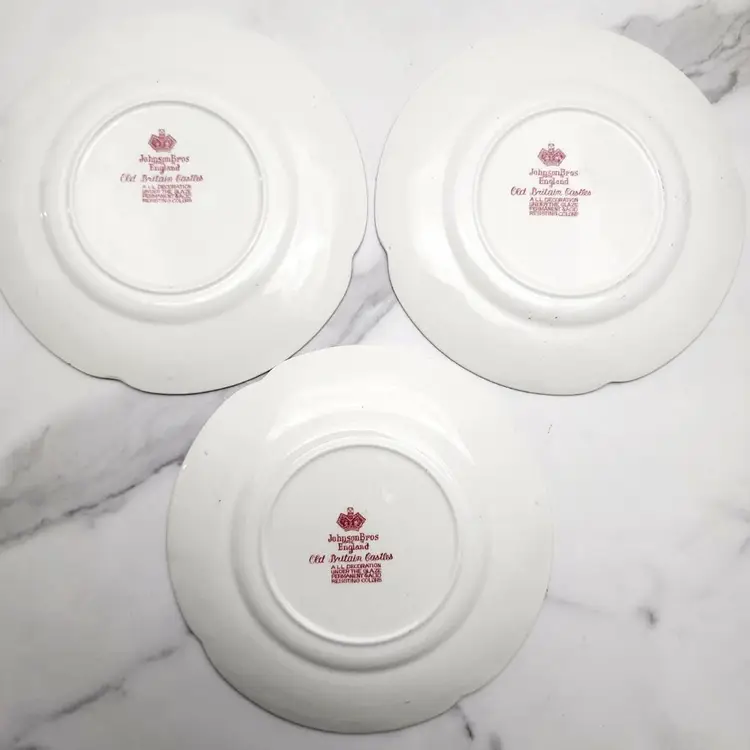 Set of 6 Old Britain Castles Pink (Crown Made in England backstamp) Bread & Butter Plates. Marked Haddon Hall in 1792 on front. Pattern: Old Britain Castles Pink (Crown Made in England) Discontinured Made by: Johnson Brothers England Type of China: Bread plate 6 3/8 in Condition: Used. Some fading. No Chips or Cracks. There is Crazing & Fleabites on backs.