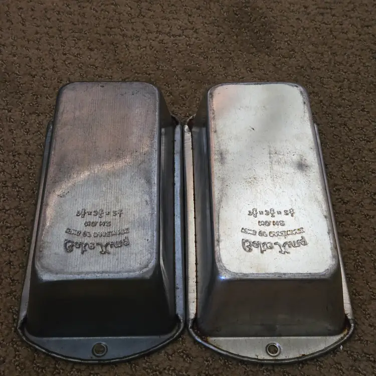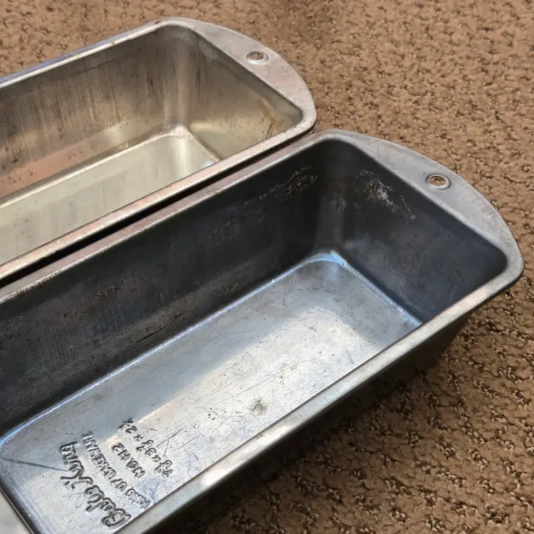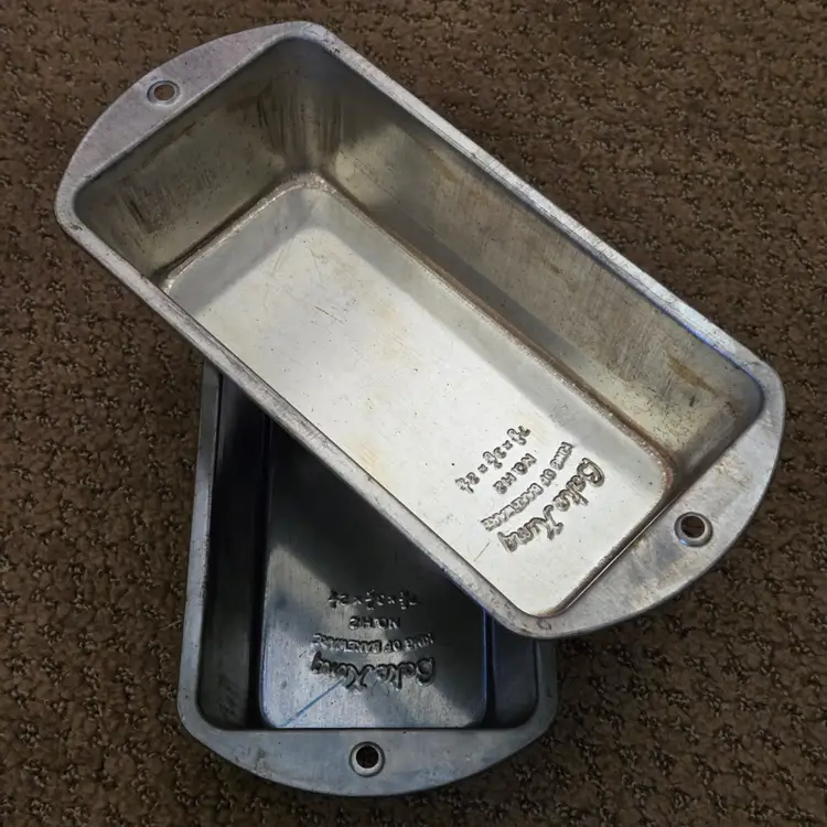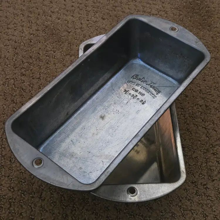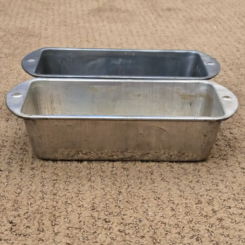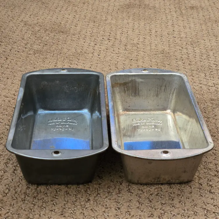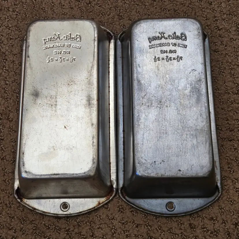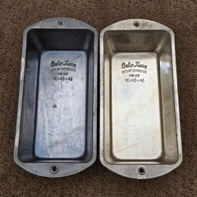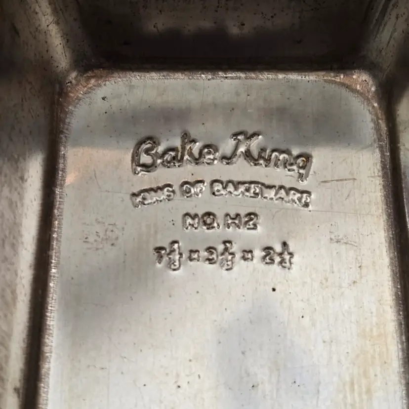Bread Loaf Pans Bake King 8⅞" Long x 2" Tall Metal No. H2 set of 2 with Issues. Used condition with some tarnish, rust and dirt in crevices one pan looks older and more used while the other has less signs of use and is cleaner. Please view all the photos and please ask any questions prior to purchase when possible.
