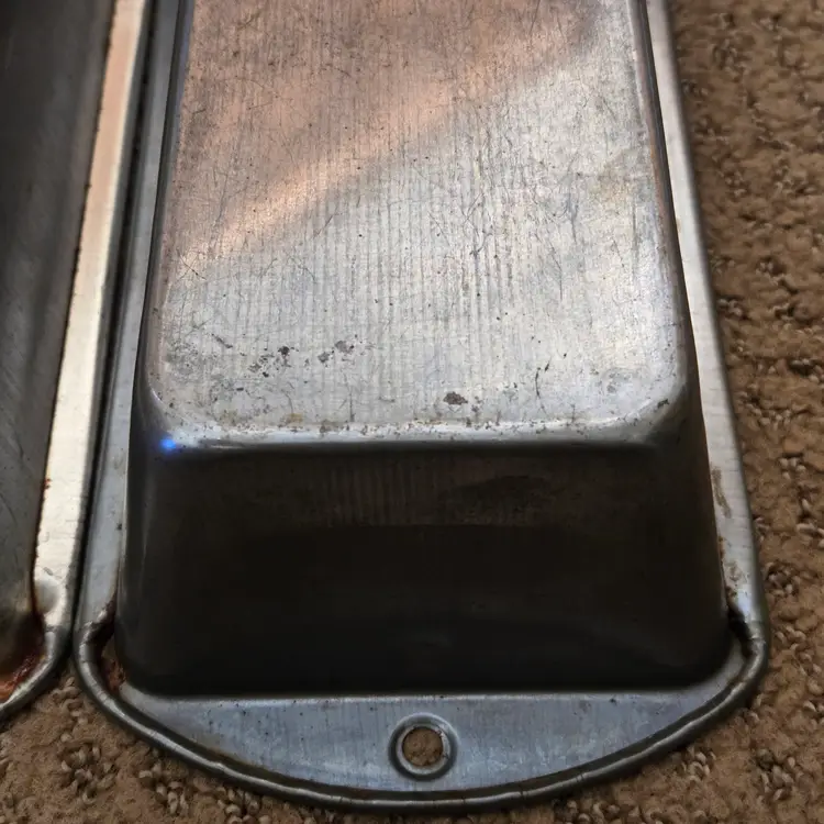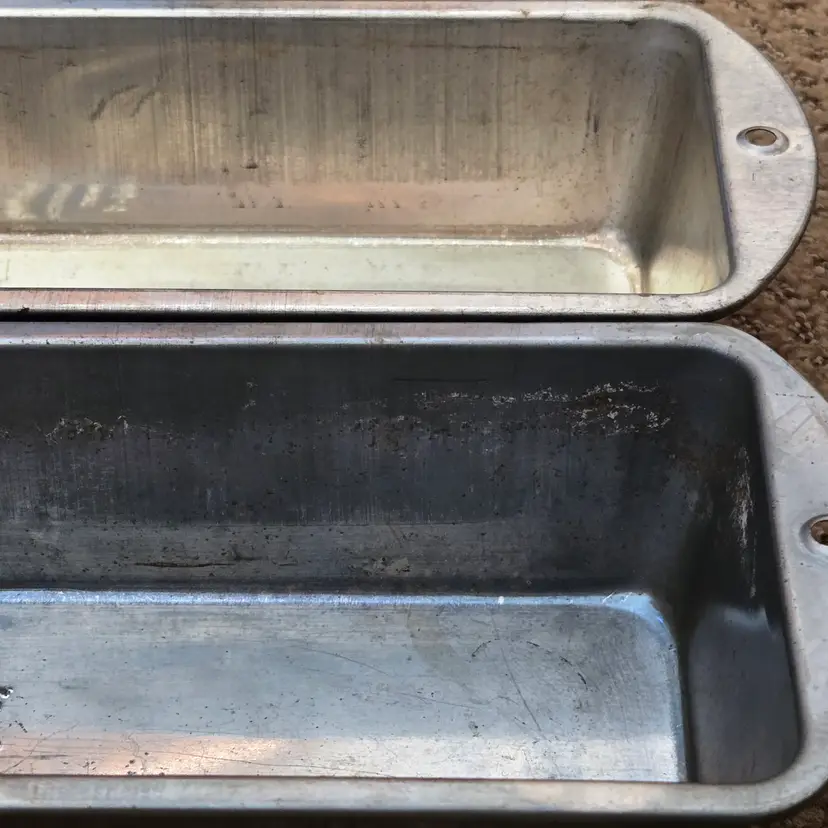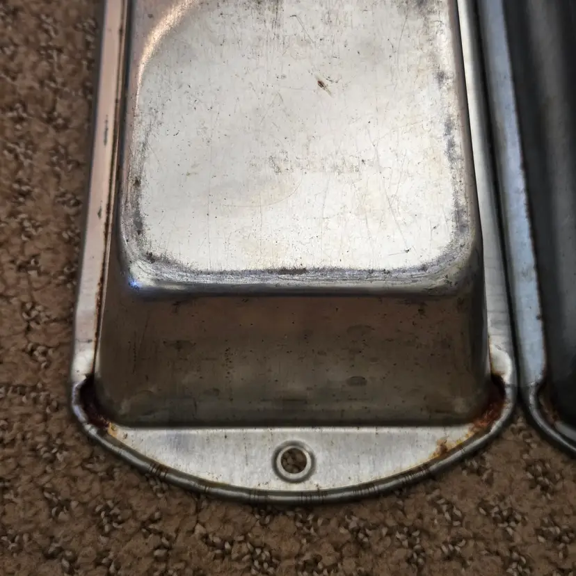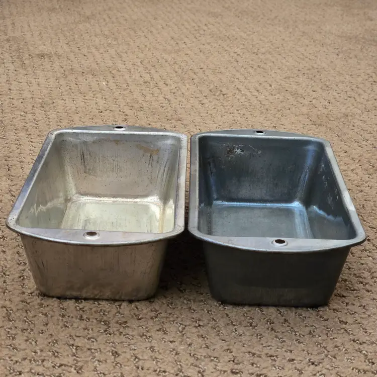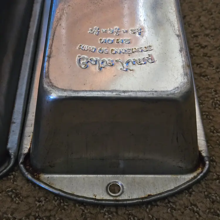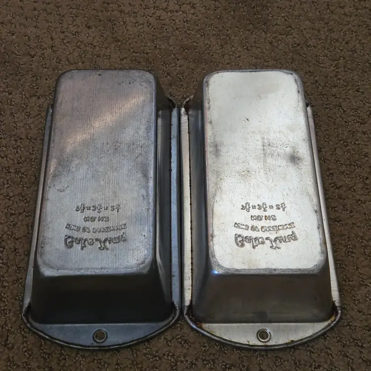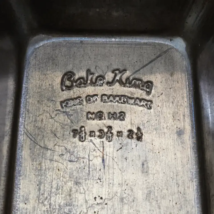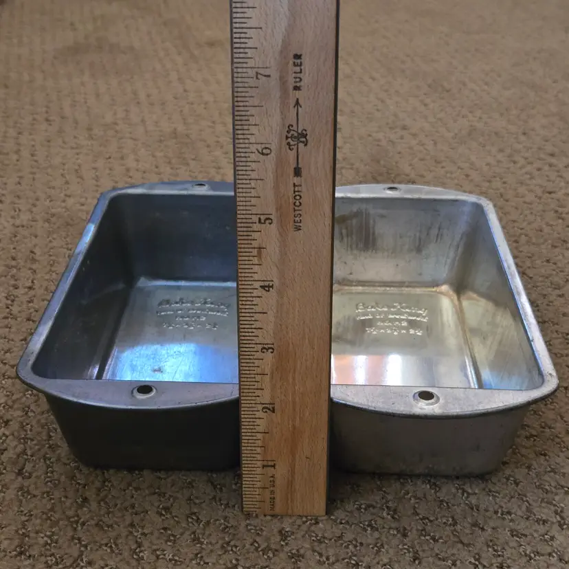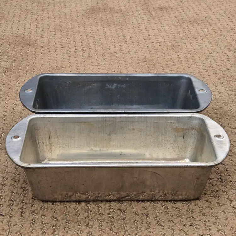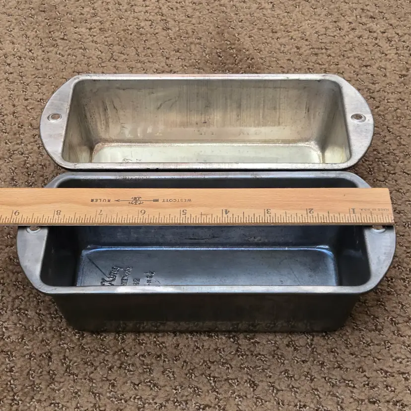 Bread Loaf Pans Bake King 8⅞" Long x 2" Tall Metal No. H2 set of 2 with Issues. Used condition with some tarnish, rust and dirt in crevices one pan looks older and more used while the other has less signs of use and is cleaner. Please view all the photos and please ask any questions prior to purchase when possible.