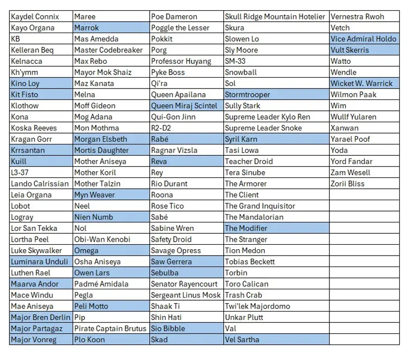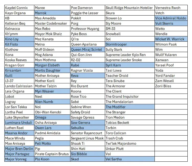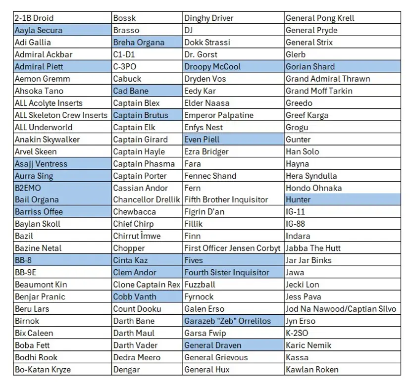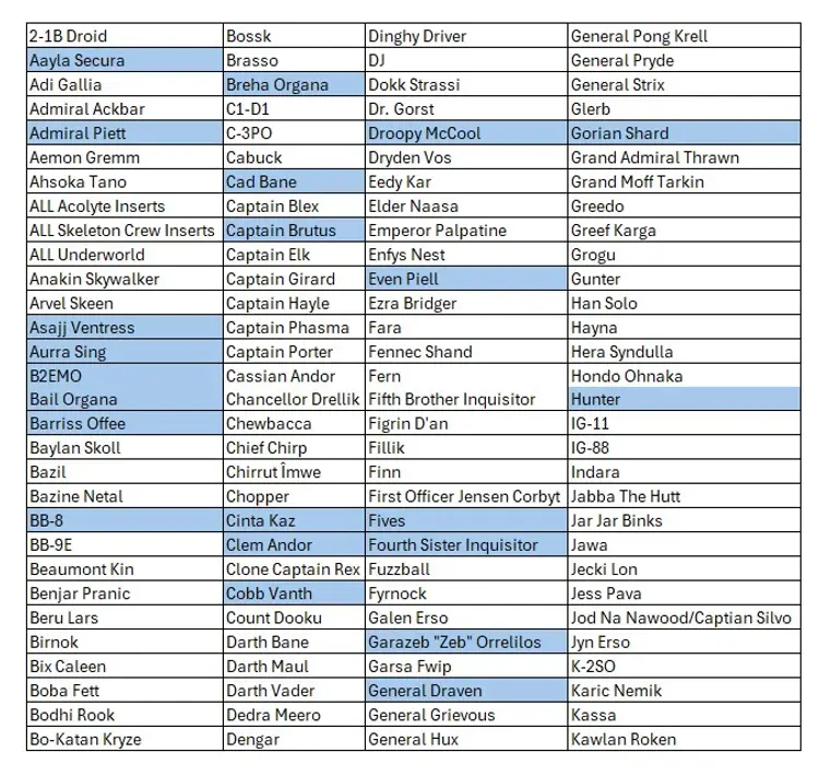200 Character spots available for Sale - 256 characters on the checklist NinjaSquirrel will random the additional 56 spots and to buyers in the break - highlighted in blue are the known signers in the checklist.