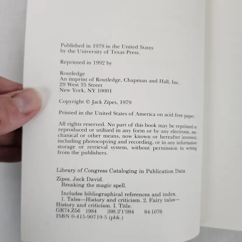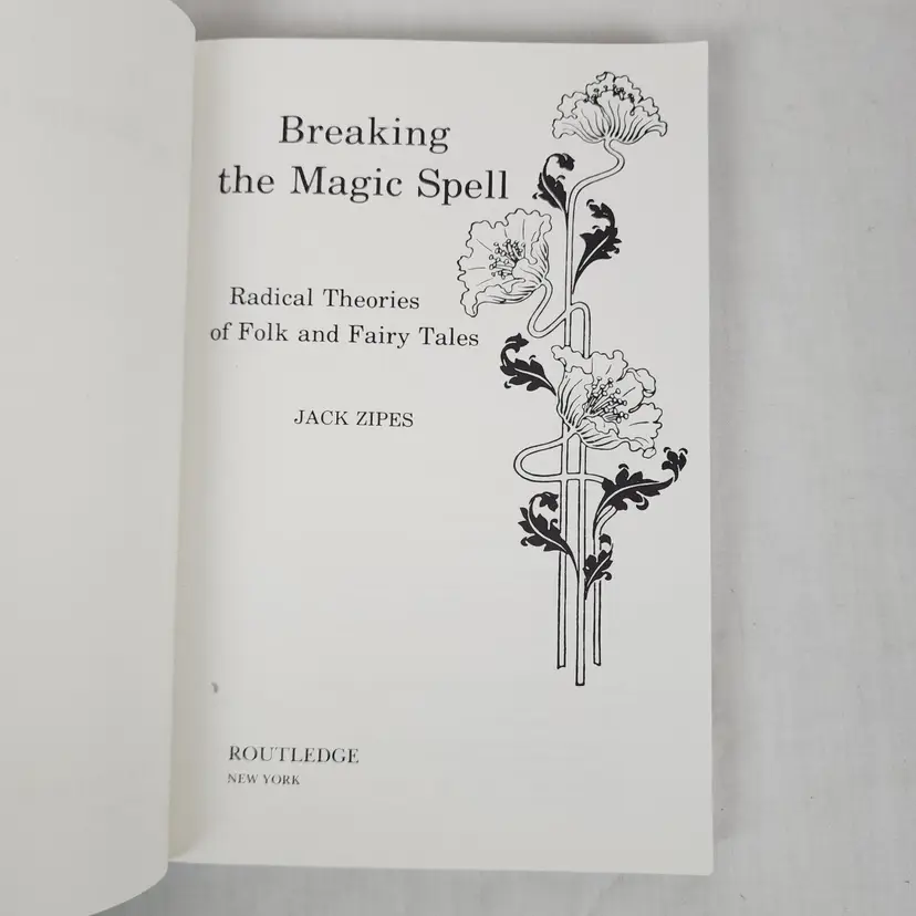 Publication Year: 1992 Format: Paperback Language: English Book Title: Breaking the Magic Spell Author: Jack Zipes Narrative Type: Nonfiction Genre: Magic Topic: Cultural History, Folk Tales Country/Region of Manufacture: United States Vintage: Yes