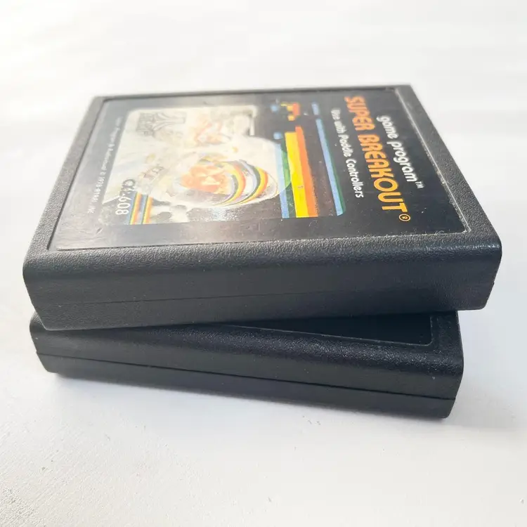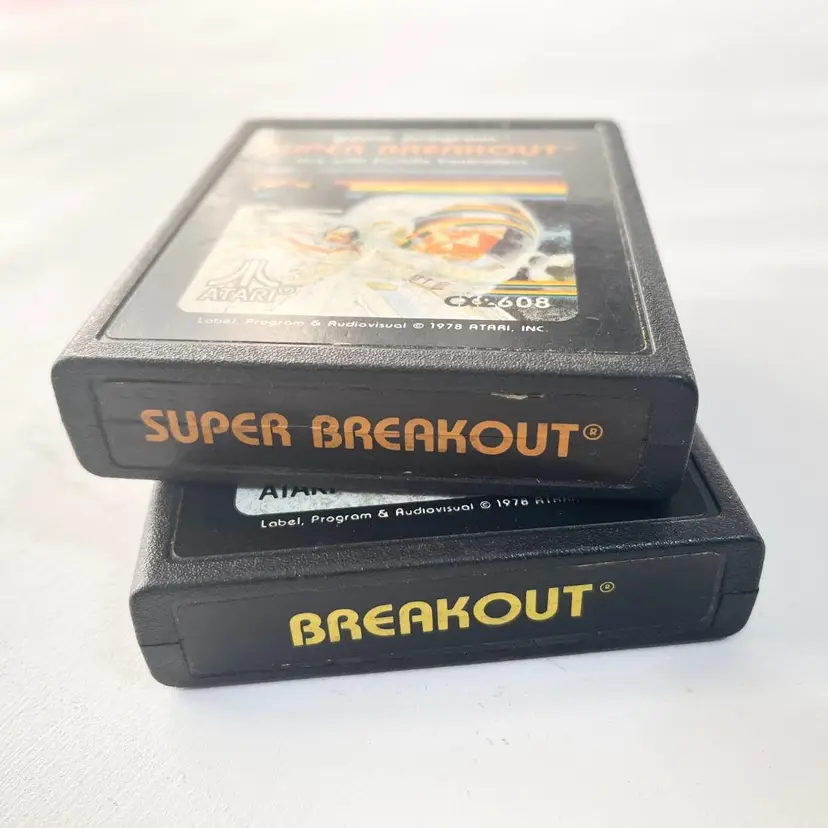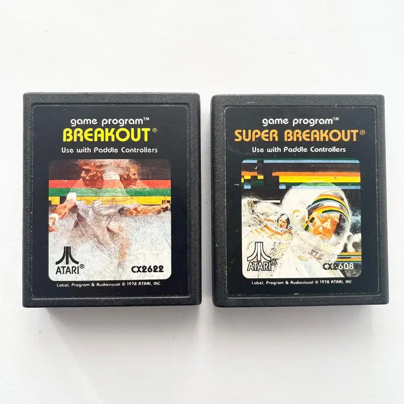 1978 Breakout & Super Breakout Atari 2600 Video Game Cartridges Vintage 1970s CX2622, CX2608 Old Video Games Cartridges Only (Console, Paddle Controllers, Box NOT INCLUDED) Genre: Arcade Game (Sports Tennis) Region: NTSC-U/C (US/Canada) By Atari Inc. Condition: Acceptable. Obvious and significant wear on the labels and cartridges but still operational. Visit my store to see more vintage ephemera, advertising, novelties, gifts, estate sale and yard sale finds SKU B1 Bin