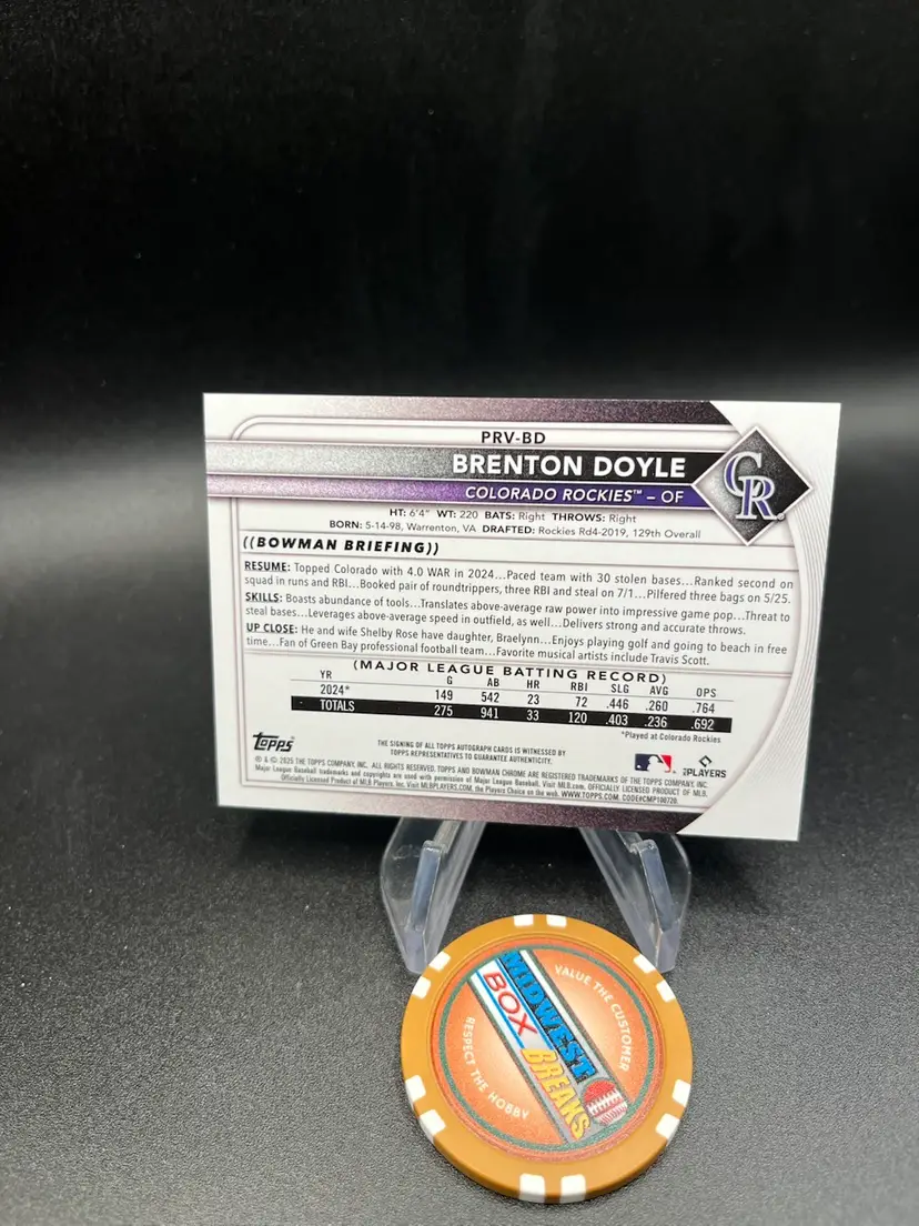 This is a Brenton Doyle auto from 2025 Bowman. Colorado Rockies.