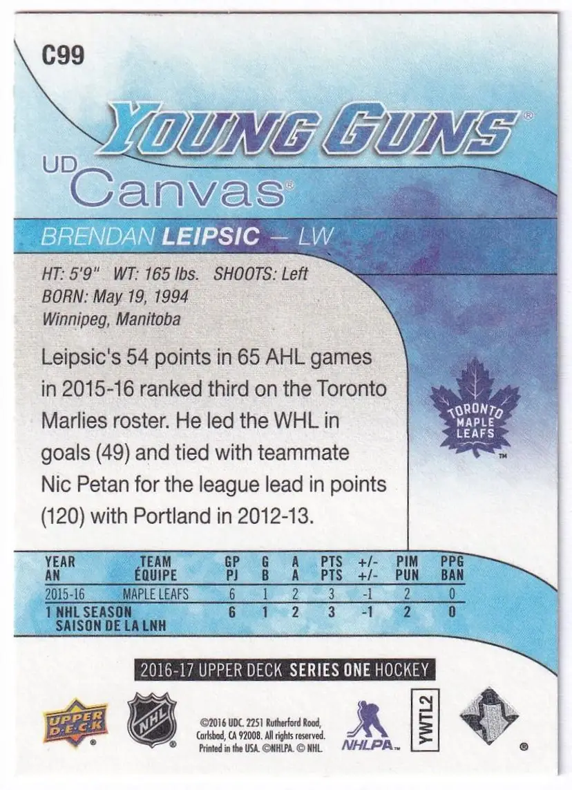 2016-17 Upper Deck Canvas #C99 Brendan Leipsic YG Toronto Maple Leafs Young Guns