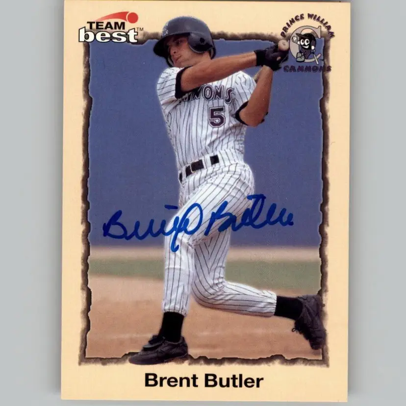 Authentic 1998 Team Best baseball card featuring Brent Butler of the Prince William Cannons, graced with his signature. A unique collectible for Cannons fans and autograph enthusiasts. Your purchase supports Signatures For Soldiers and their work with homeless and disabled veterans.